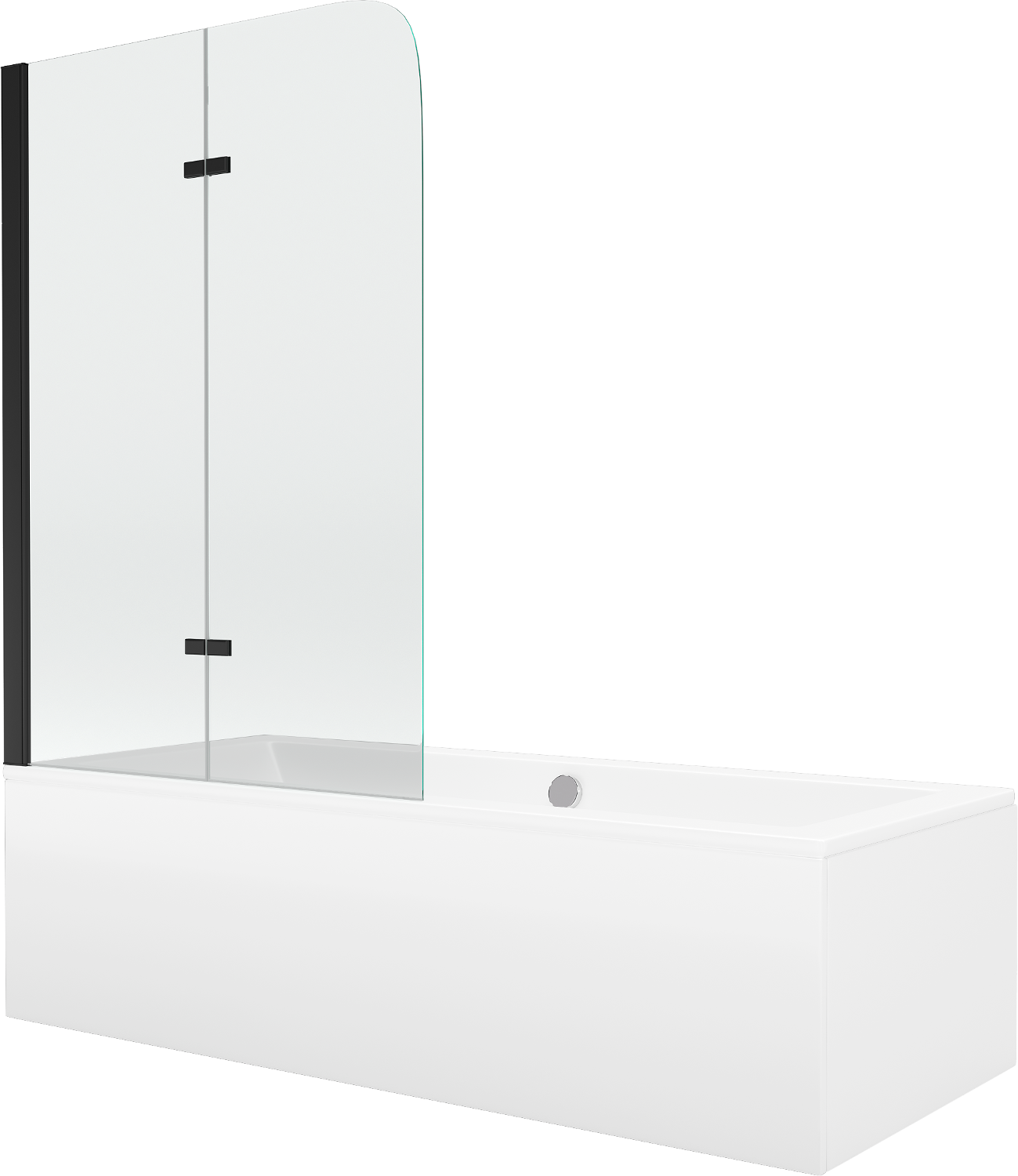 Écrã feito de duas portas com possibilidade de dobrar. Esta solução permite economizar mais espaço na casa de banho e permite o uso livre do espaço restante quando não estamos a usar a área de banho.