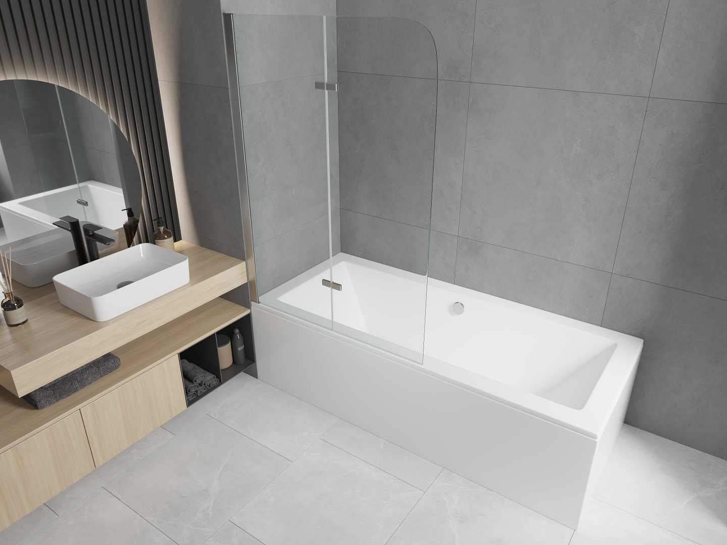 Écrã feito de duas portas com possibilidade de dobrar. Esta solução permite economizar mais espaço na casa de banho e permite o uso livre do espaço restante quando não estamos a usar a área de banho.