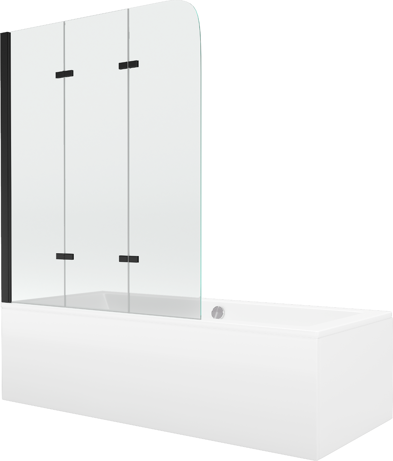 Resguardo fabricado com três folhas, podendo ser dobrado. Esta solução permite poupar mais espaço na casa de banho e possibilita o uso livre do restante espaço quando a zona de banho não está em uso.
