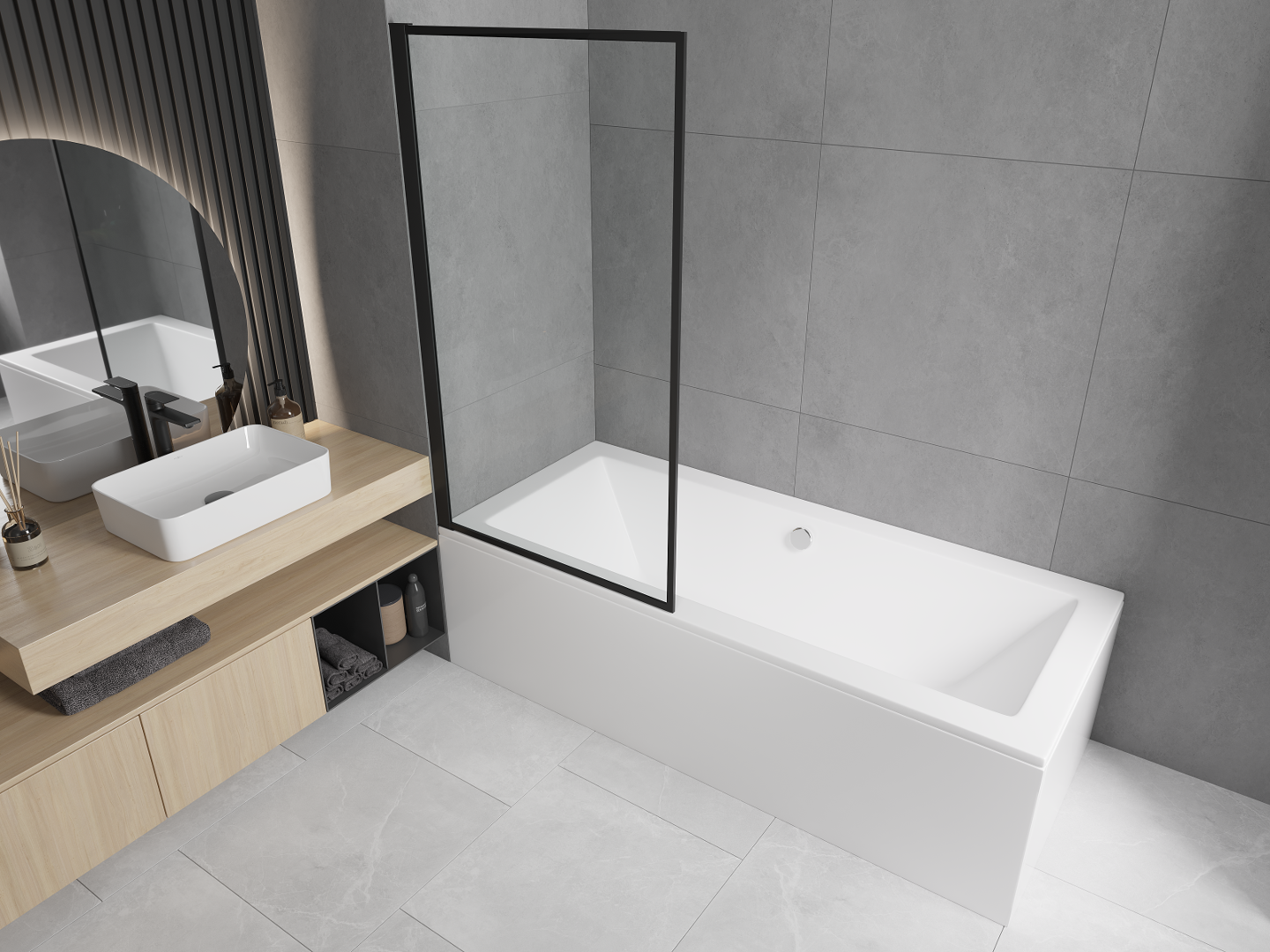 Proteção eficaz contra o derramamento de água durante o banho. O parapeito possui vedações que se ajustam perfeitamente à superfície do vidro e à borda da banheira. Solução funcional que garante segurança e fácil manutenção da limpeza.