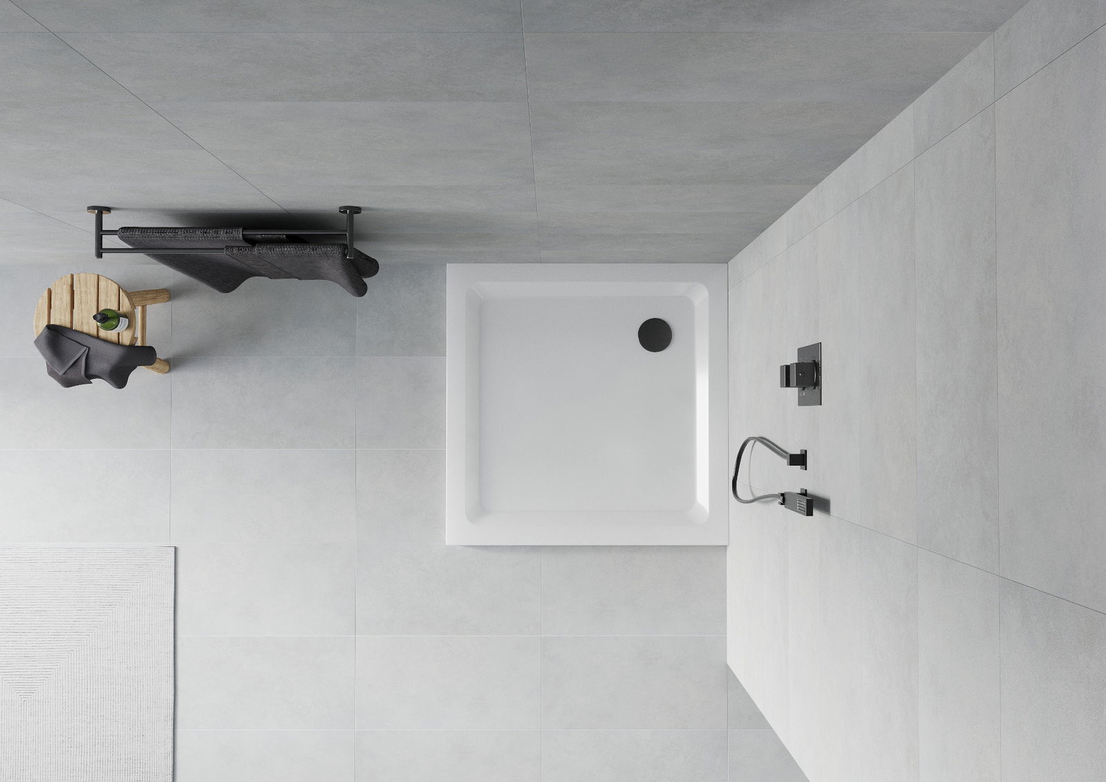 A base de duche foi concebida de forma a permitir que a água escoe livremente na direção do ralo. Assegura uma drenagem rápida e eficiente da água da superfície da base de duche, prevenindo a formação de poças e o alagamento da casa de banho.