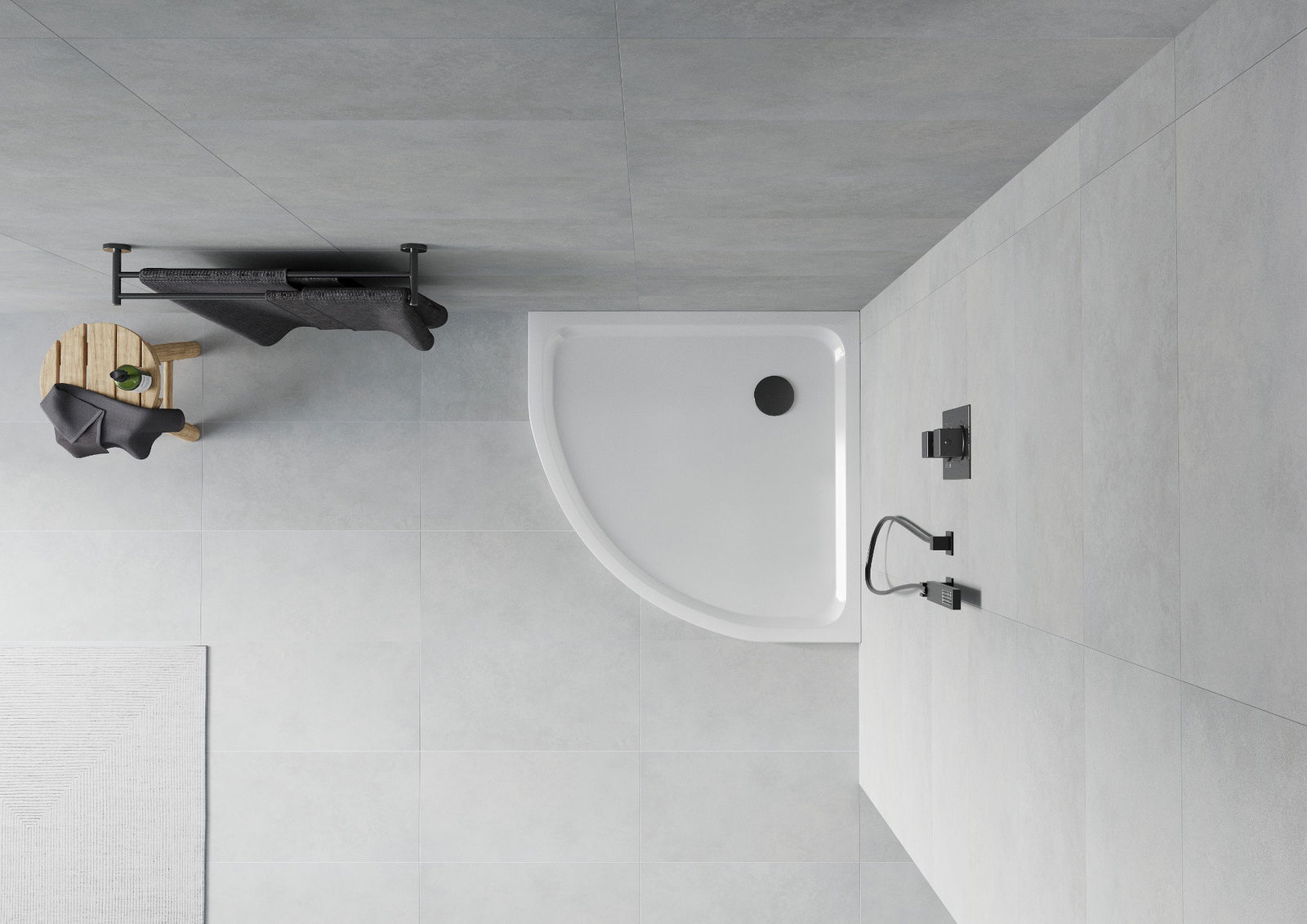 A base de duche foi concebida de forma a permitir que a água escoe livremente na direção do ralo. Assegura uma drenagem rápida e eficiente da água da superfície da base de duche, prevenindo a formação de poças e o alagamento da casa de banho.