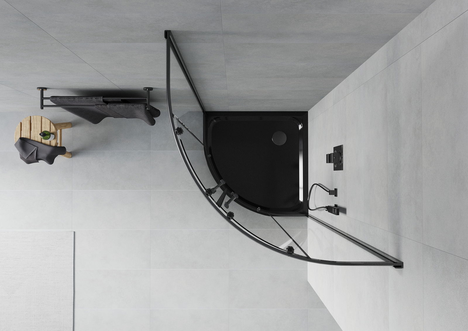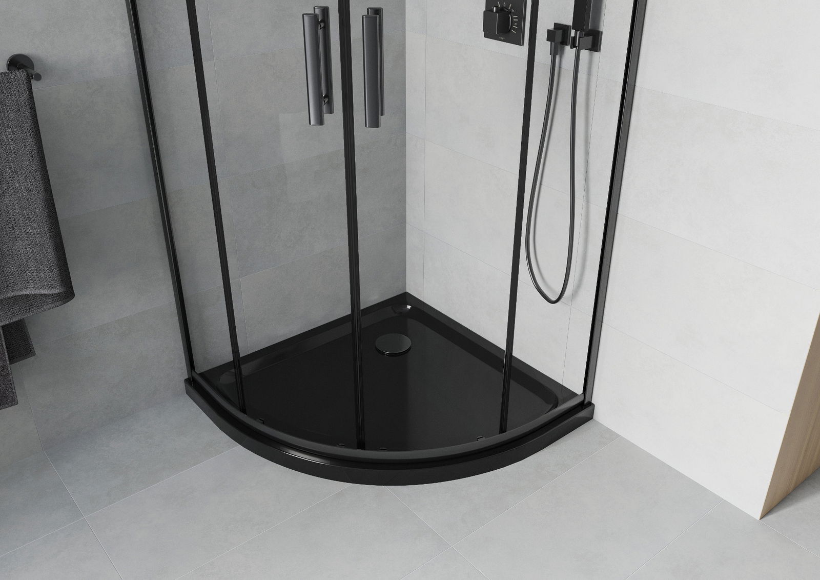 A pega prática e confortável foi feita de metal durável e resistente. A forma moderna combinada com o acabamento ajustado à cor dos perfis confere a todo o conjunto uma aparência moderna e estilosa, realçando a estética de qualquer casa de banho.