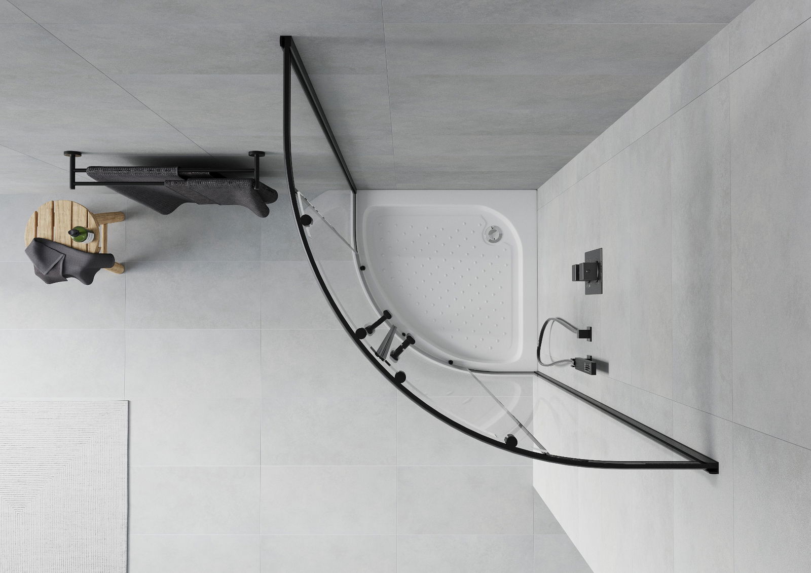 A pega prática e confortável foi feita de metal durável e resistente. A forma moderna combinada com o acabamento ajustado à cor dos perfis confere a todo o conjunto uma aparência moderna e estilosa, realçando a estética de qualquer casa de banho.
