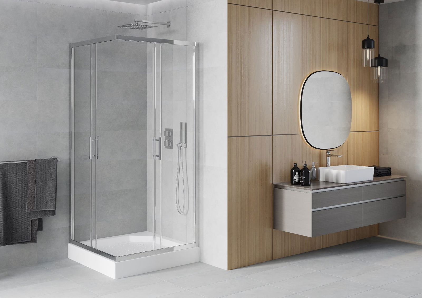 A pega prática e confortável foi feita de metal durável e resistente. A forma moderna combinada com o acabamento ajustado à cor dos perfis confere a todo o conjunto uma aparência moderna e estilosa, realçando a estética de qualquer casa de banho.