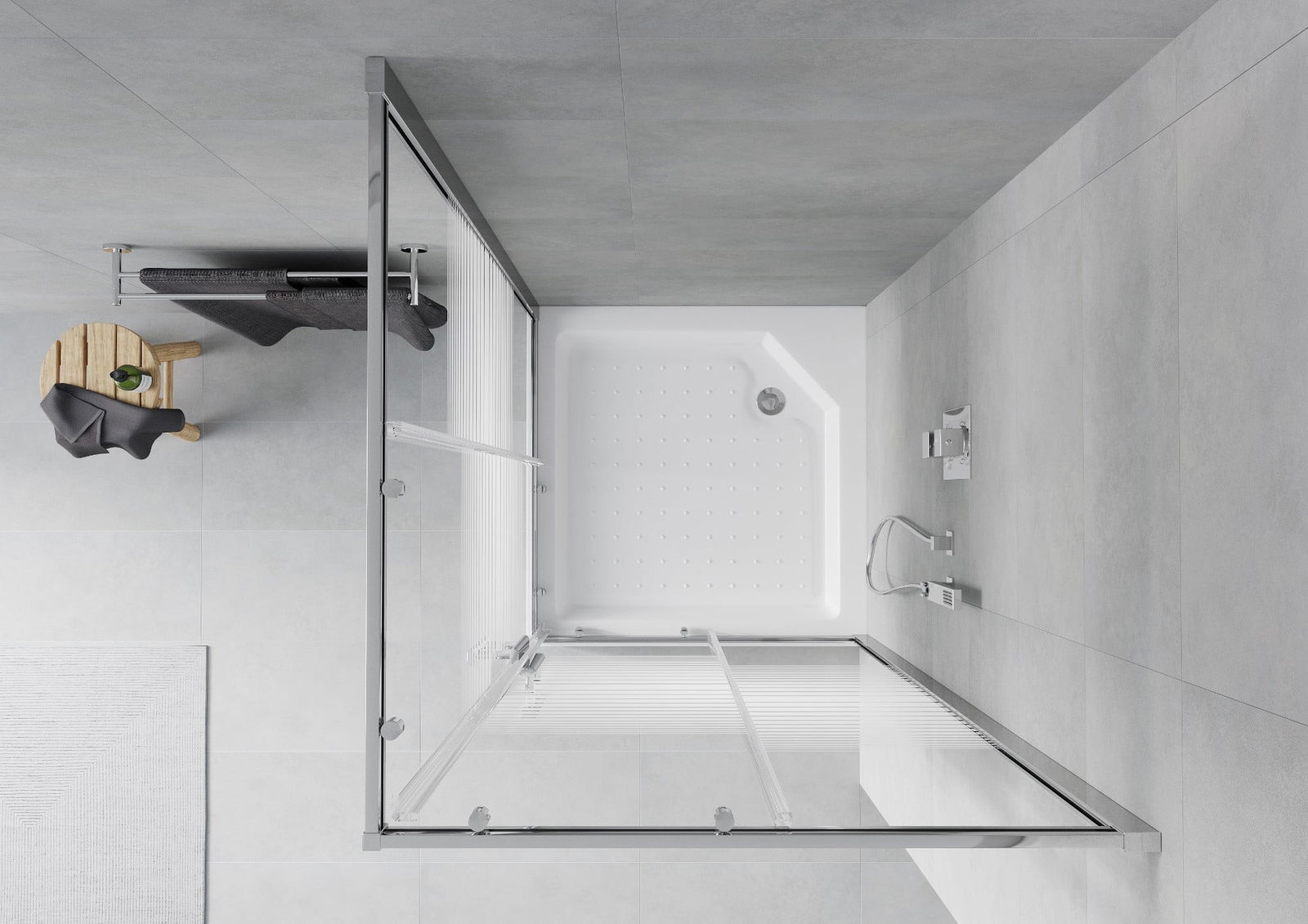 A pega prática e confortável foi feita de metal durável e resistente. A forma moderna combinada com o acabamento ajustado à cor dos perfis confere a todo o conjunto uma aparência moderna e estilosa, realçando a estética de qualquer casa de banho.