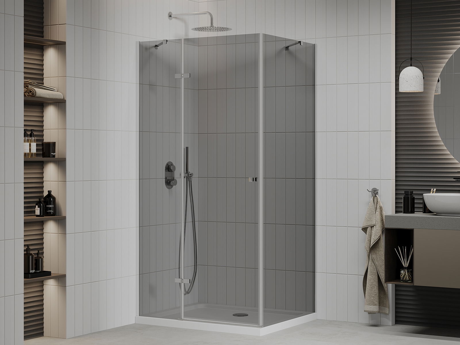A pega prática e confortável foi feita de metal durável e resistente. A forma moderna combinada com o acabamento ajustado à cor dos perfis confere a todo o conjunto uma aparência moderna e estilosa, realçando a estética de qualquer casa de banho.