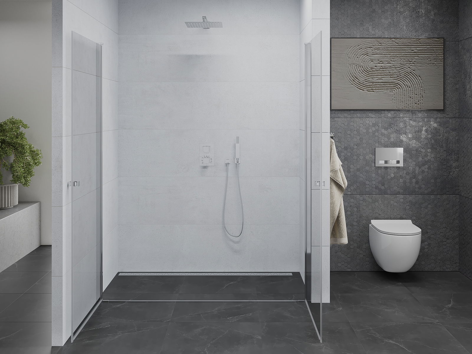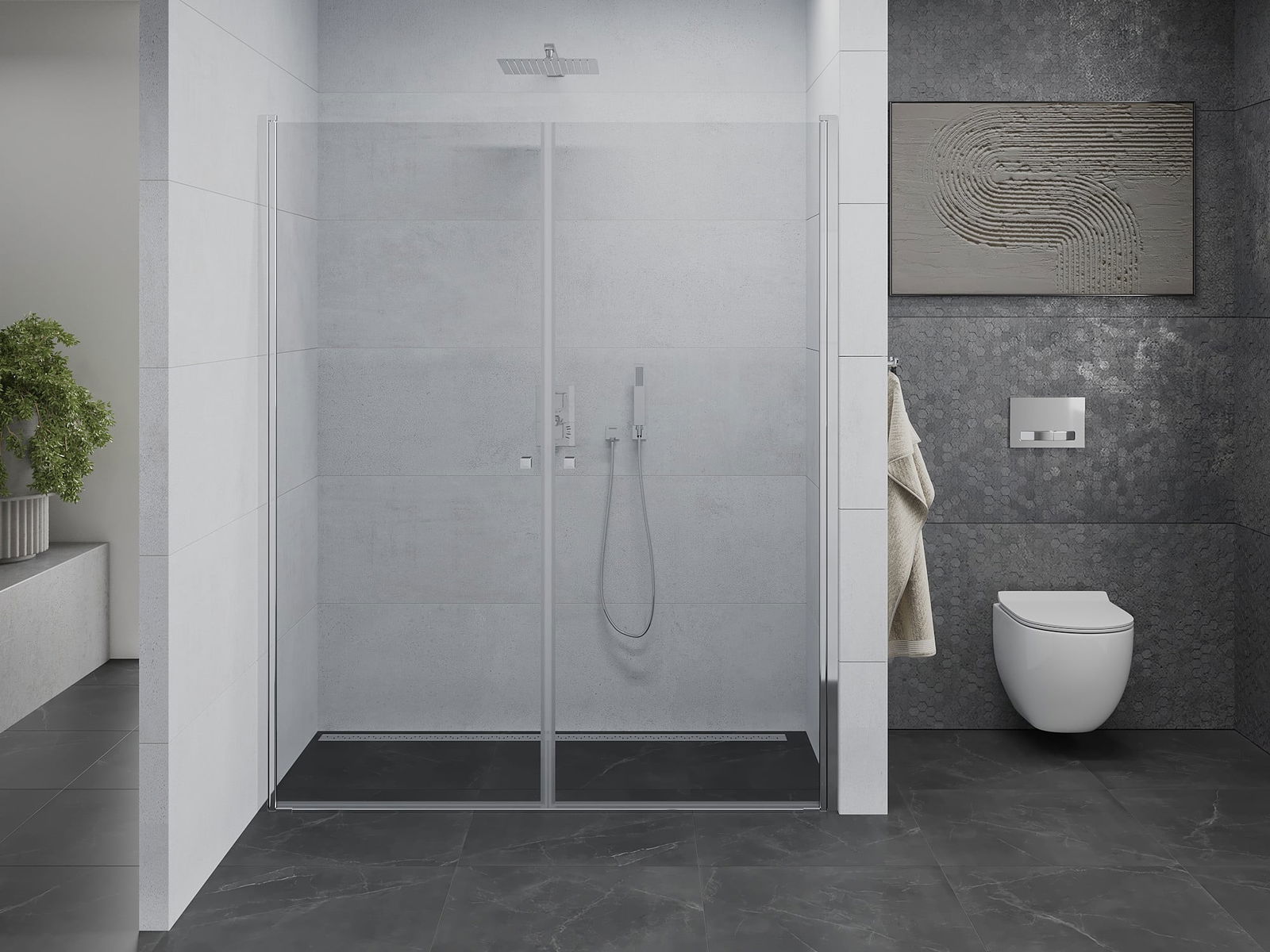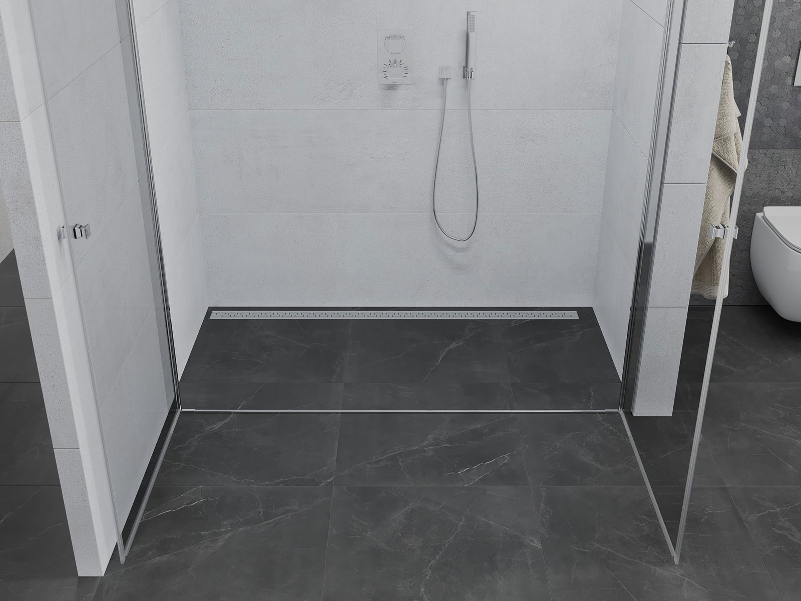 A pega prática e confortável foi feita de metal durável e resistente. A forma moderna combinada com o acabamento ajustado à cor dos perfis confere a todo o conjunto uma aparência moderna e estilosa, realçando a estética de qualquer casa de banho.