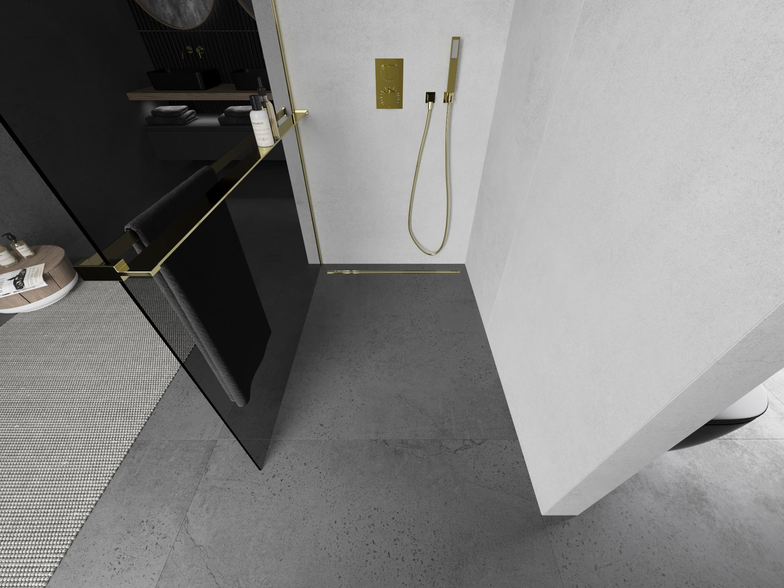 Mexen Kioto+ Parede de duche com prateleira Walk-in 80 x 200 cm, grafite, dourada - 800-080-121-50-40