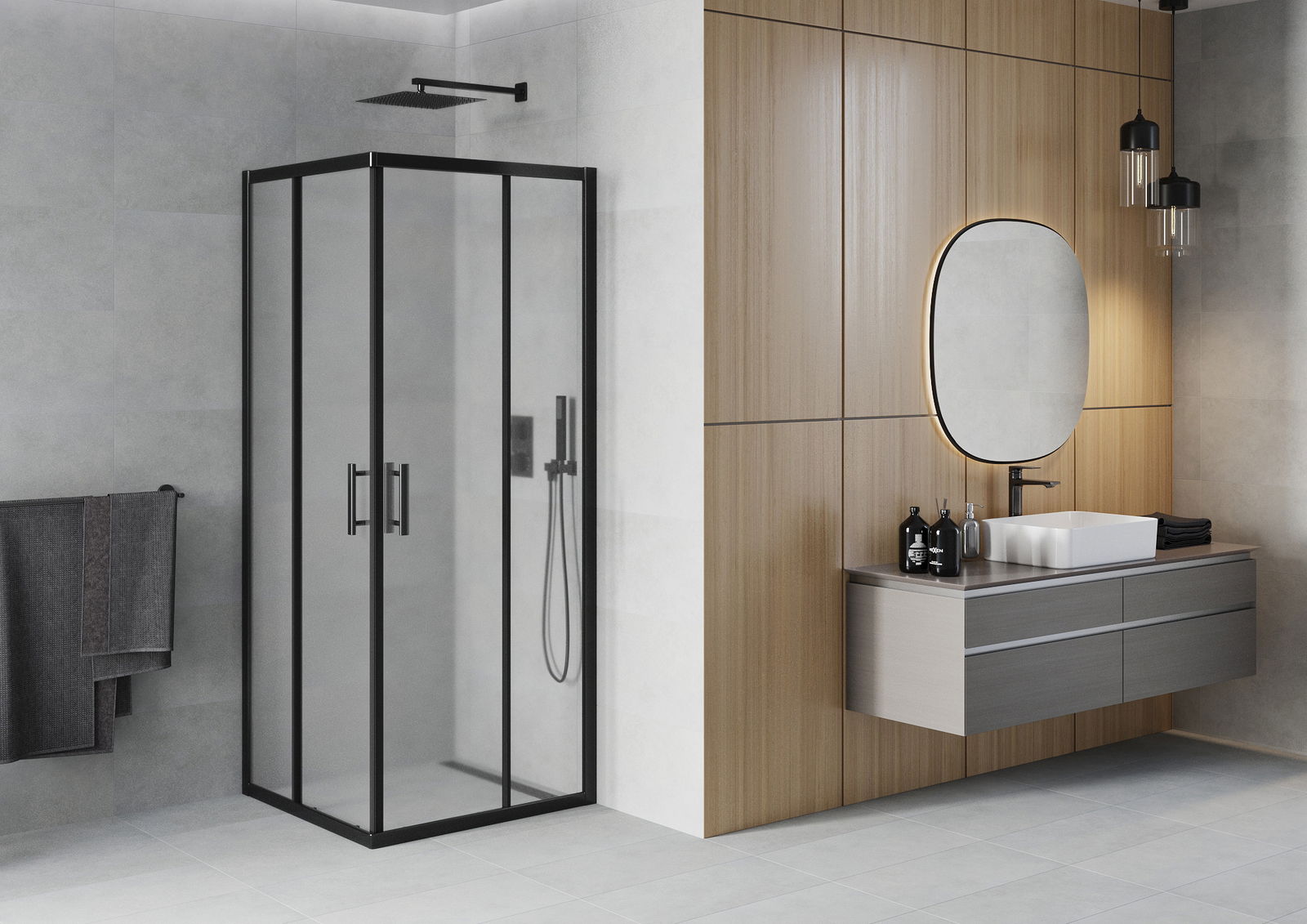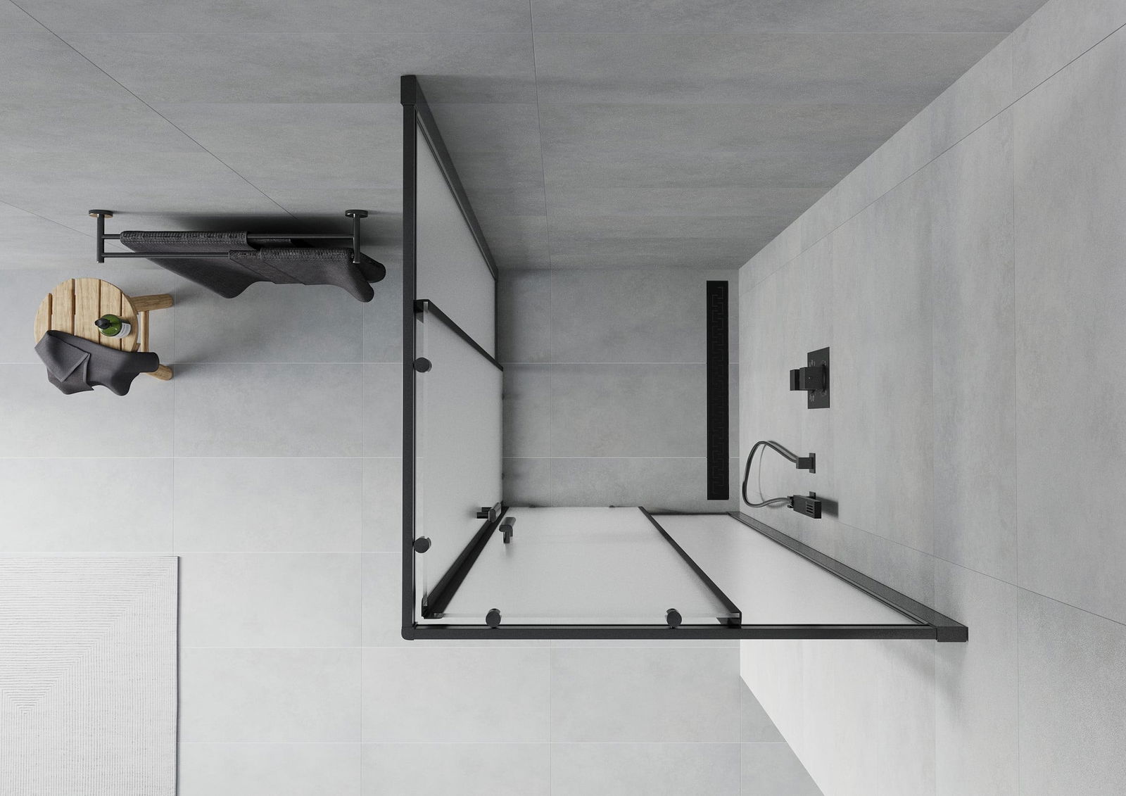 A pega prática e confortável foi feita de metal durável e resistente. A forma moderna combinada com o acabamento ajustado à cor dos perfis confere a todo o conjunto uma aparência moderna e estilosa, realçando a estética de qualquer casa de banho.