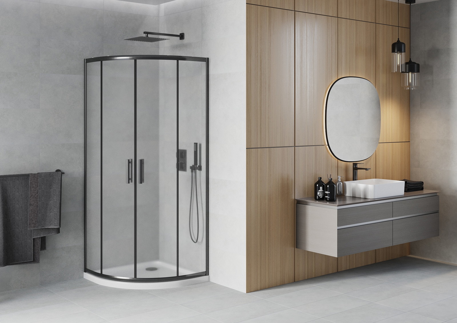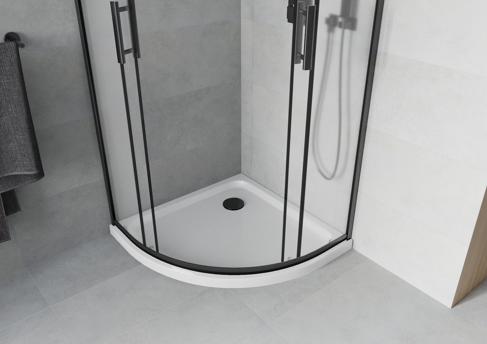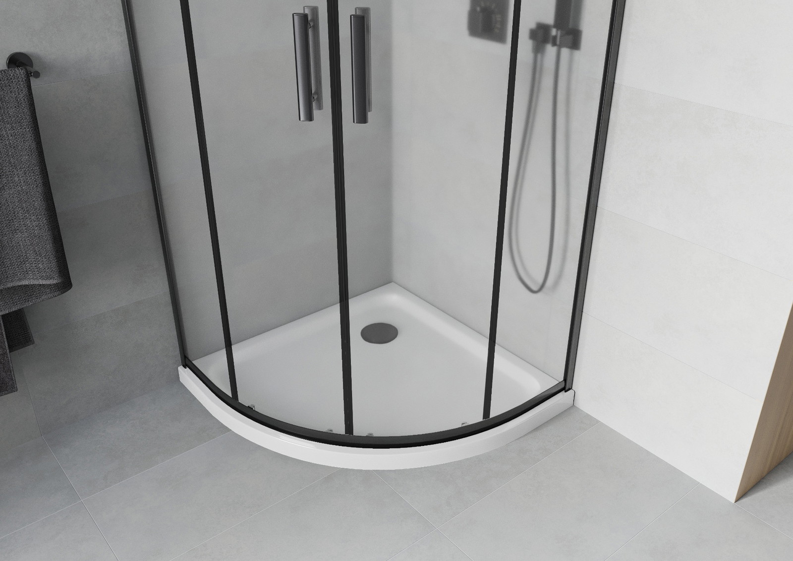 A pega prática e confortável foi feita de metal durável e resistente. A forma moderna combinada com o acabamento ajustado à cor dos perfis confere a todo o conjunto uma aparência moderna e estilosa, realçando a estética de qualquer casa de banho.
