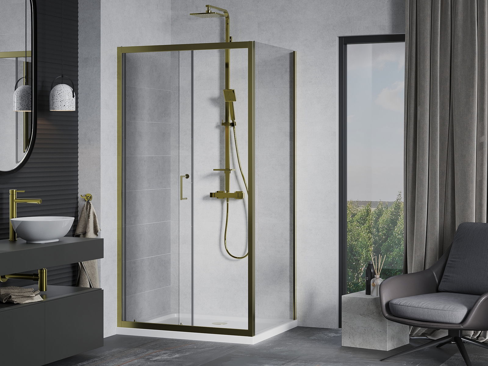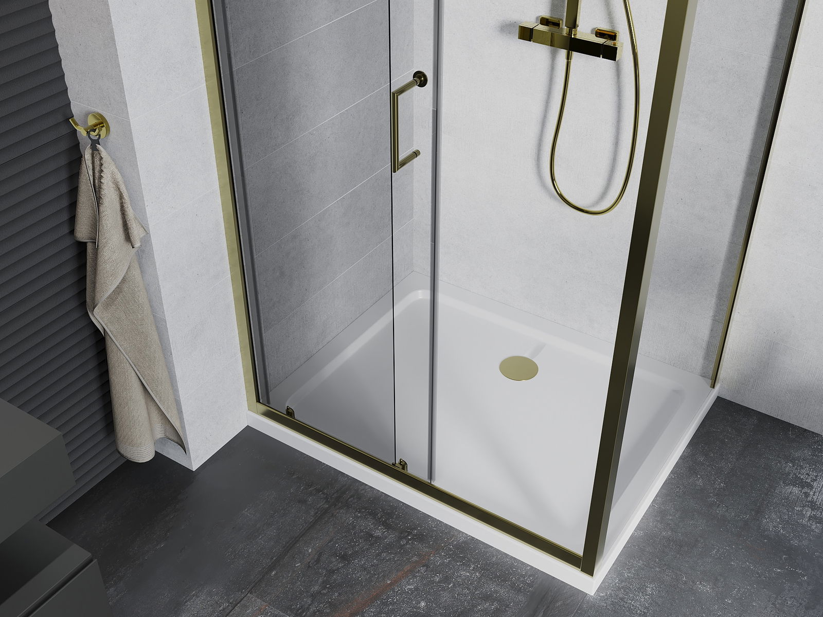 A pega prática e confortável foi feita de metal durável e resistente. A forma moderna combinada com o acabamento ajustado à cor dos perfis confere a todo o conjunto uma aparência moderna e estilosa, realçando a estética de qualquer casa de banho.