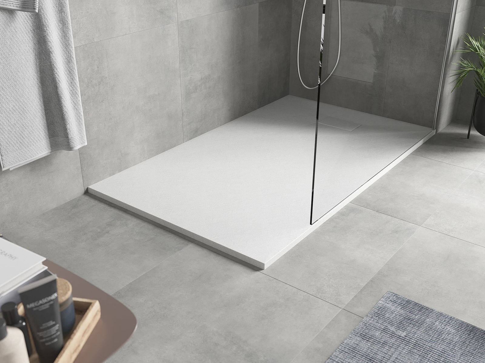 A superfície do tabuleiro do chuveiro assemelha-se a uma pedra na sua estrutura. Constitui uma combinação excecional de aparência natural com um design de interiores moderno. Adiciona caráter, realça a estética e a elegância da decoração da casa de banho e encanta com a sua forma.