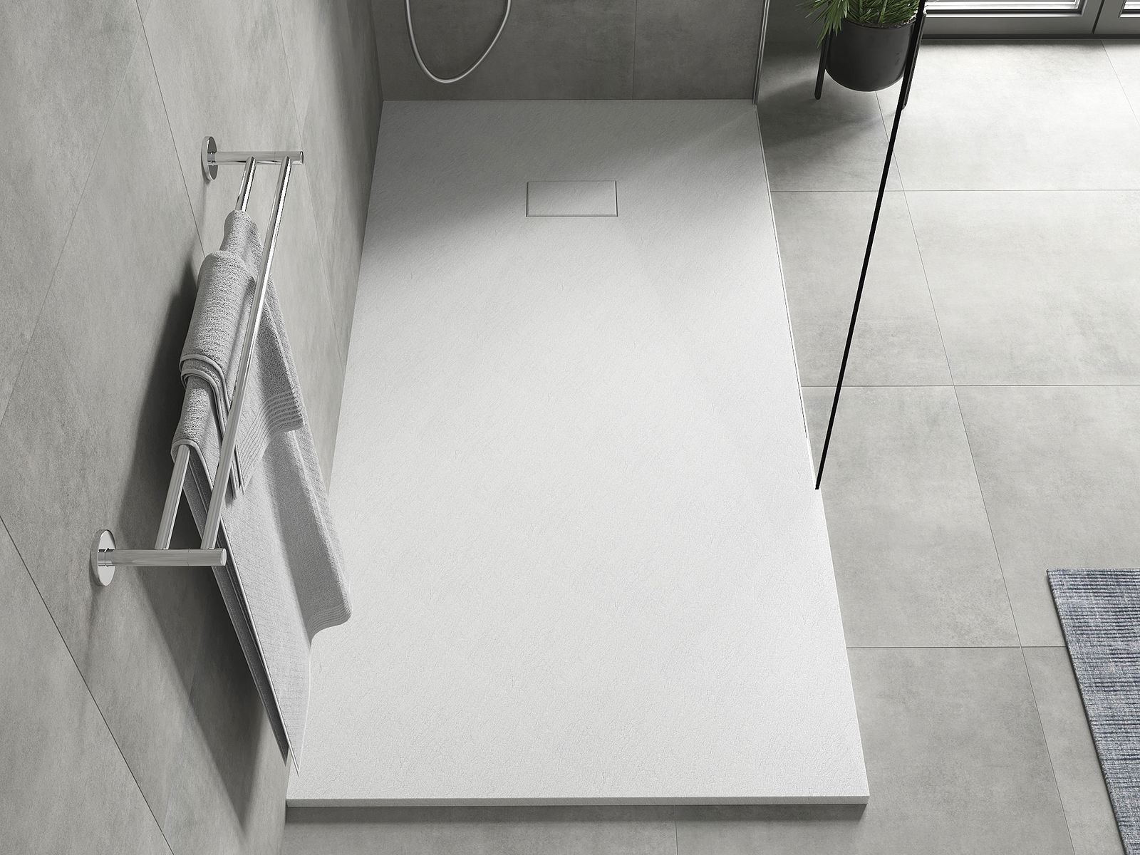 A superfície do tabuleiro do chuveiro assemelha-se a uma pedra na sua estrutura. Constitui uma combinação excecional de aparência natural com um design de interiores moderno. Adiciona caráter, realça a estética e a elegância da decoração da casa de banho e encanta com a sua forma.