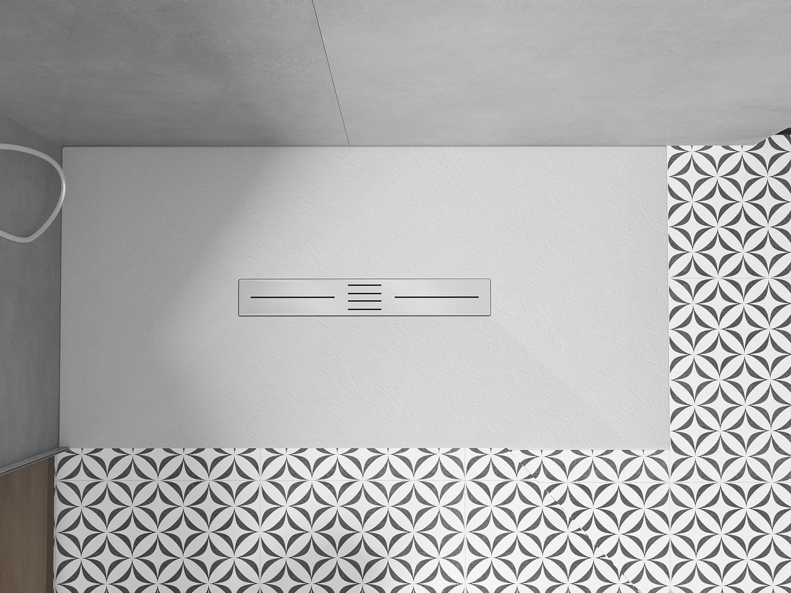 A base de duche foi concebida de forma a permitir que a água escoe livremente na direção do ralo. Assegura uma drenagem rápida e eficiente da água da superfície da base de duche, prevenindo a formação de poças e o alagamento da casa de banho.