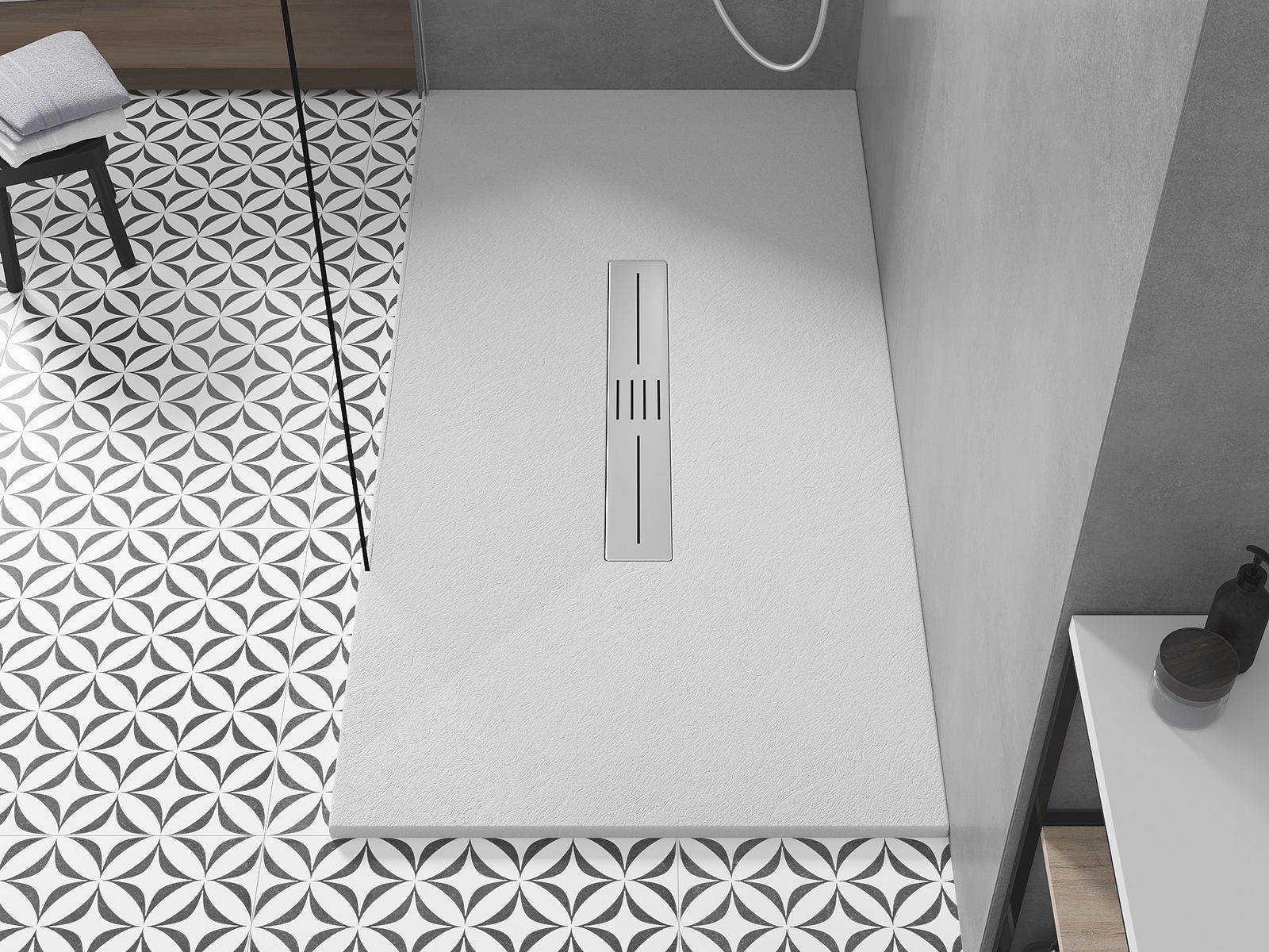 A superfície do tabuleiro do chuveiro assemelha-se a uma pedra na sua estrutura. Constitui uma combinação excecional de aparência natural com um design de interiores moderno. Adiciona caráter, realça a estética e a elegância da decoração da casa de banho e encanta com a sua forma.