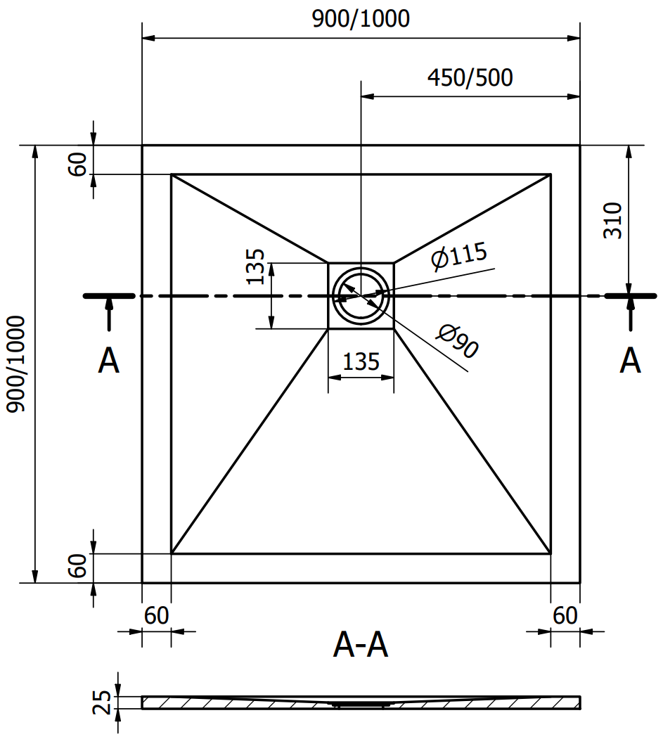 A base de duche foi concebida de forma a permitir que a água escoe livremente na direção do ralo. Assegura uma drenagem rápida e eficiente da água da superfície da base de duche, prevenindo a formação de poças e o alagamento da casa de banho.