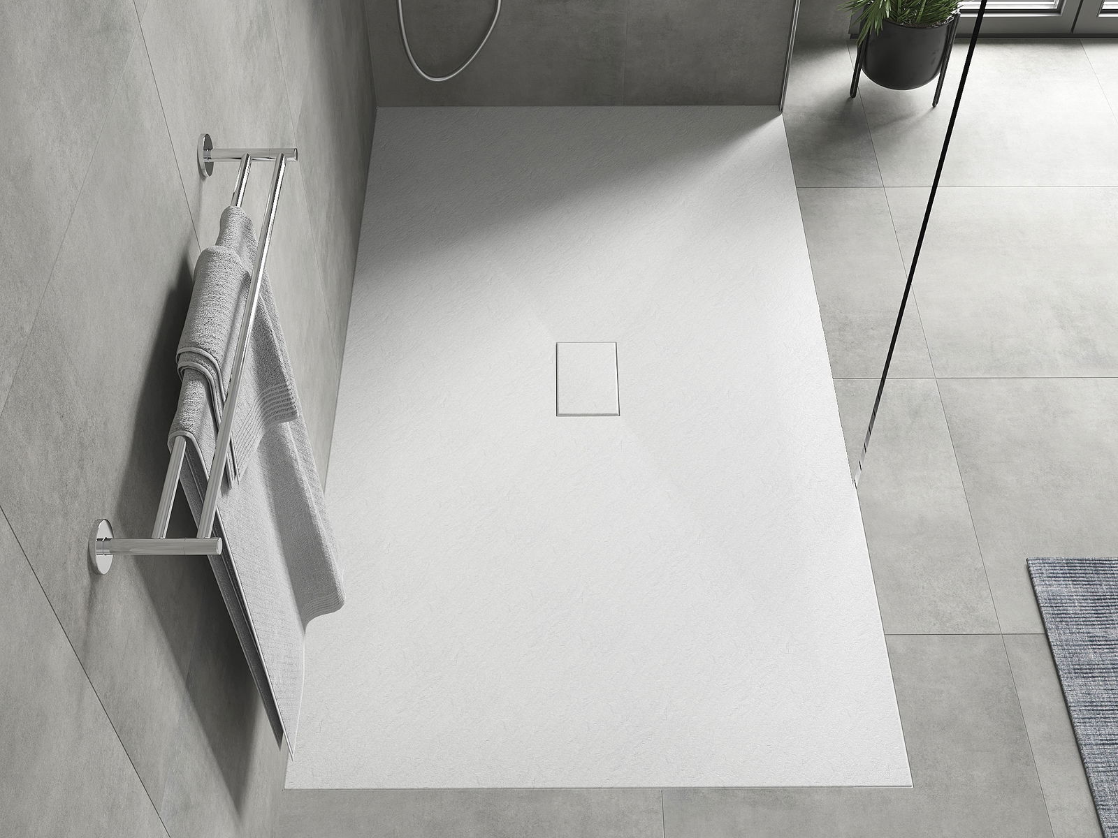 A superfície do tabuleiro do chuveiro assemelha-se a uma pedra na sua estrutura. Constitui uma combinação excecional de aparência natural com um design de interiores moderno. Adiciona caráter, realça a estética e a elegância da decoração da casa de banho e encanta com a sua forma.