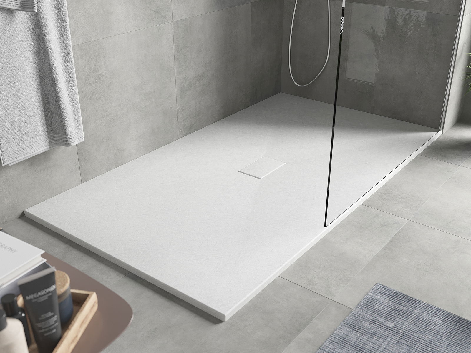 A superfície do tabuleiro do chuveiro assemelha-se a uma pedra na sua estrutura. Constitui uma combinação excecional de aparência natural com um design de interiores moderno. Adiciona caráter, realça a estética e a elegância da decoração da casa de banho e encanta com a sua forma.