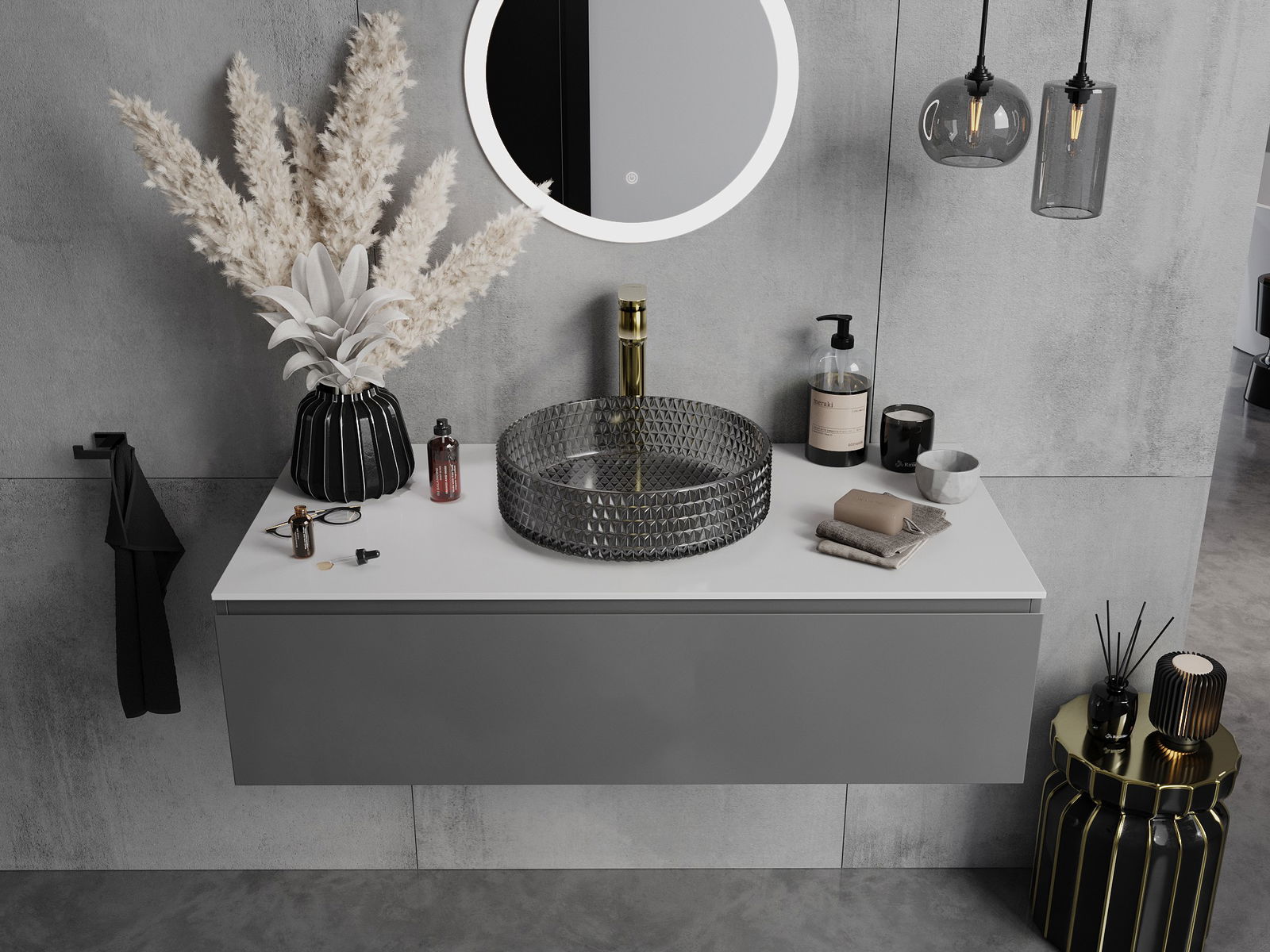 O lavatório destaca-se pela estrutura única de cristais, conferindo-lhe uma aparência inigualável e extremamente impressionante. Os cristais brilham à luz, atraindo a atenção e acrescentando elegância. Uma solução prática e estilosa para qualquer casa de banho.