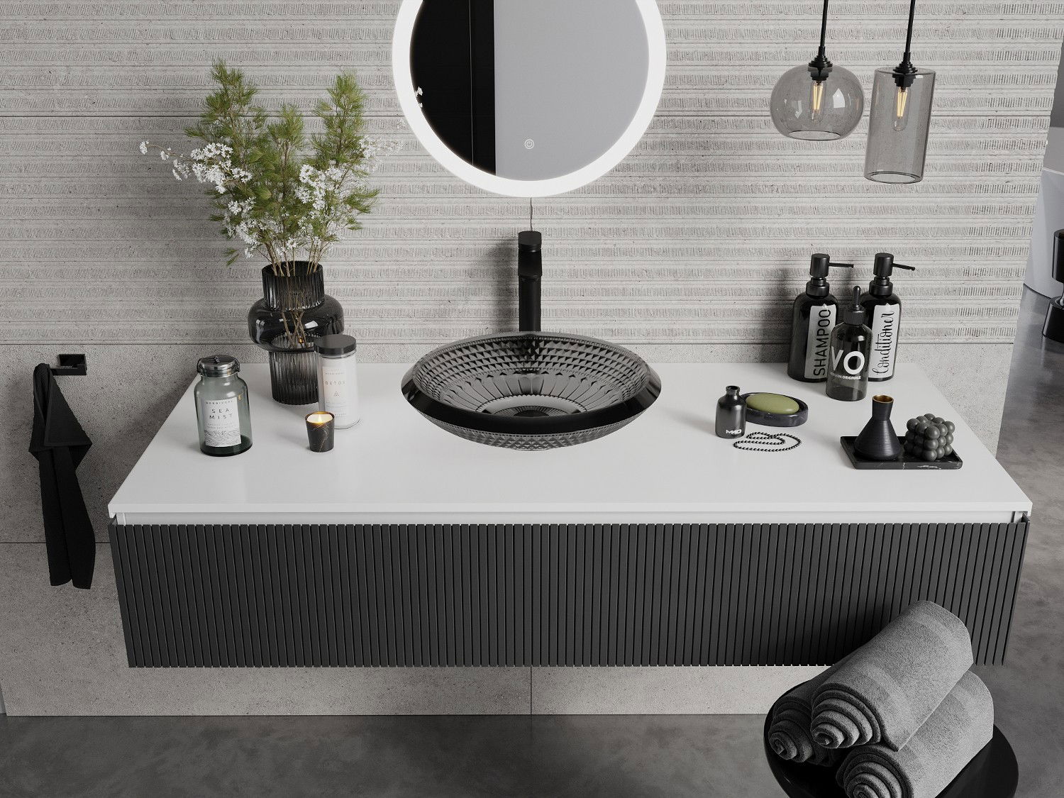 O lavatório destaca-se pela estrutura única de cristais, conferindo-lhe uma aparência inigualável e extremamente impressionante. Os cristais brilham à luz, atraindo a atenção e acrescentando elegância. Uma solução prática e estilosa para qualquer casa de banho.