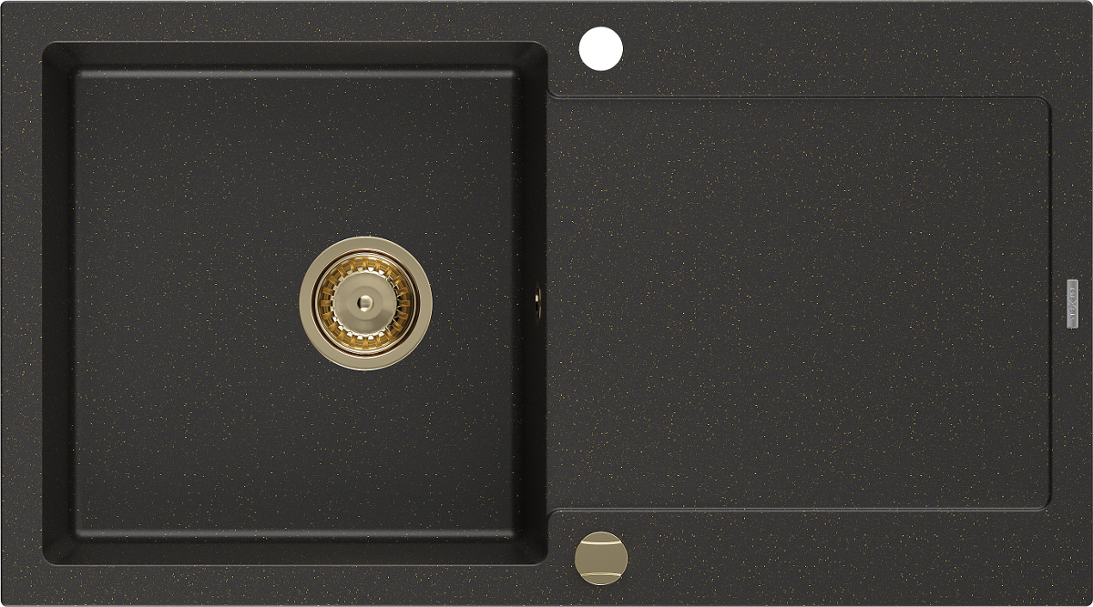 Mexen Leo lava-loiça de granito com 1 cuba com escorredor 900 x 500 mm, preto/dourado metálico, sifão dourado
