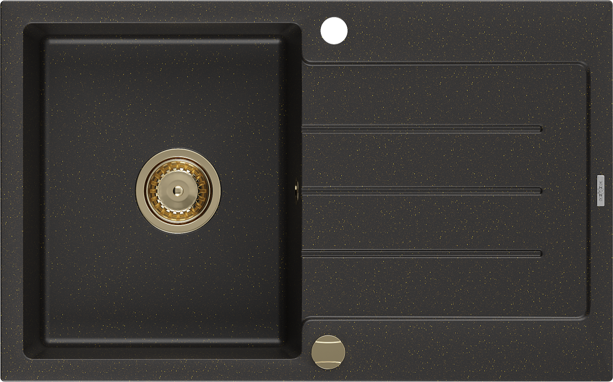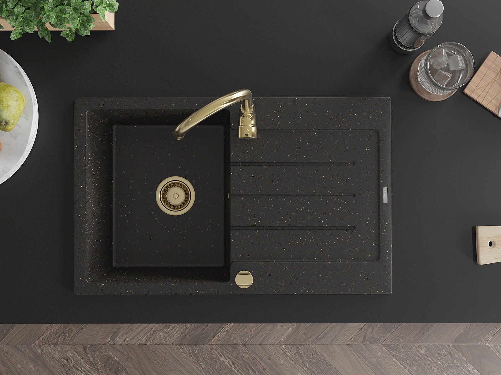 Mexen Bruno lava-loiça de granito com 1 bacia com escorredor 795 x 495 mm, preto/dourado metálico, sifão dourado
