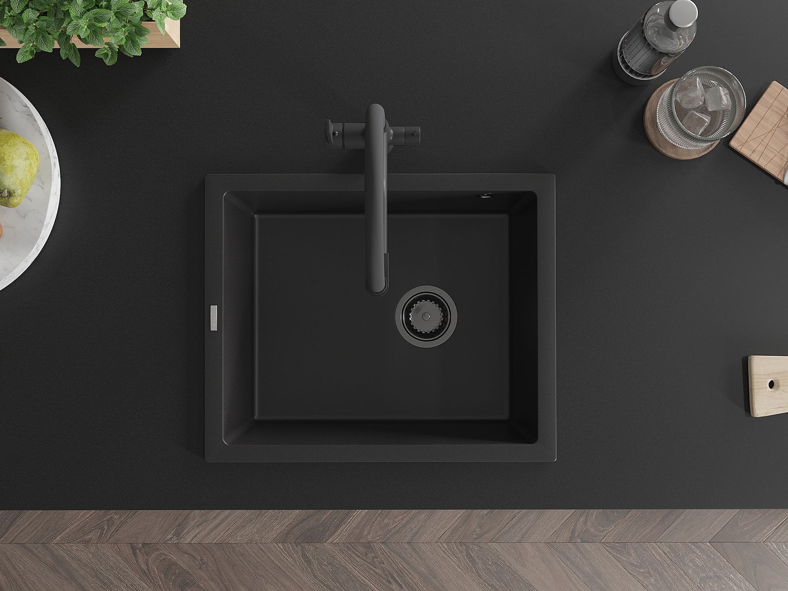 Mexen Pedro lava-loiça de granito 1-cuba 560 x 460 mm, preto, sifão preto - 6508561000-77-B