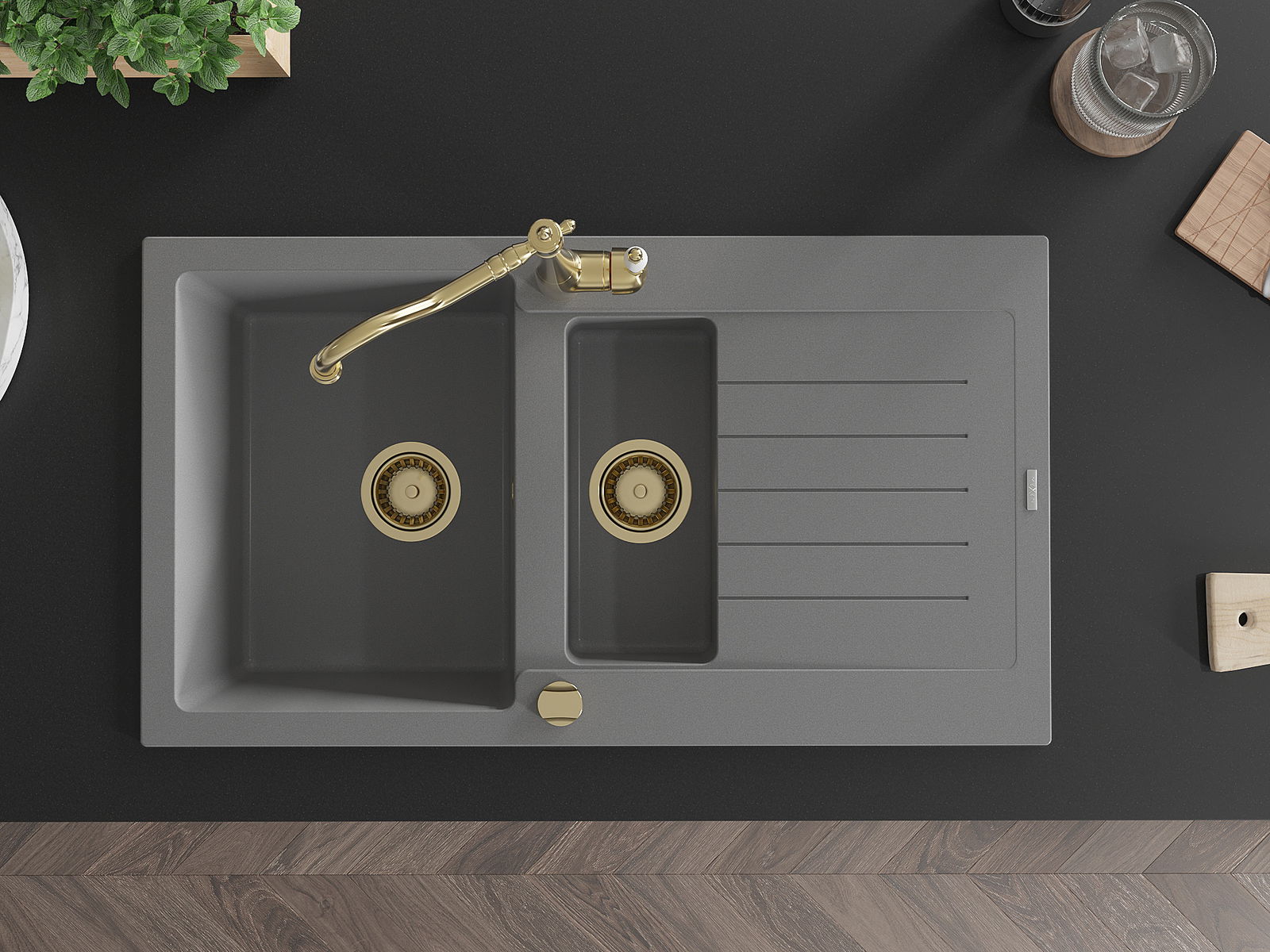 Mexen Matias lava-louça de granito de 1,5 cubas com escorredor e torneira de cozinha Carla, cinzento - 6502-71-670700-50