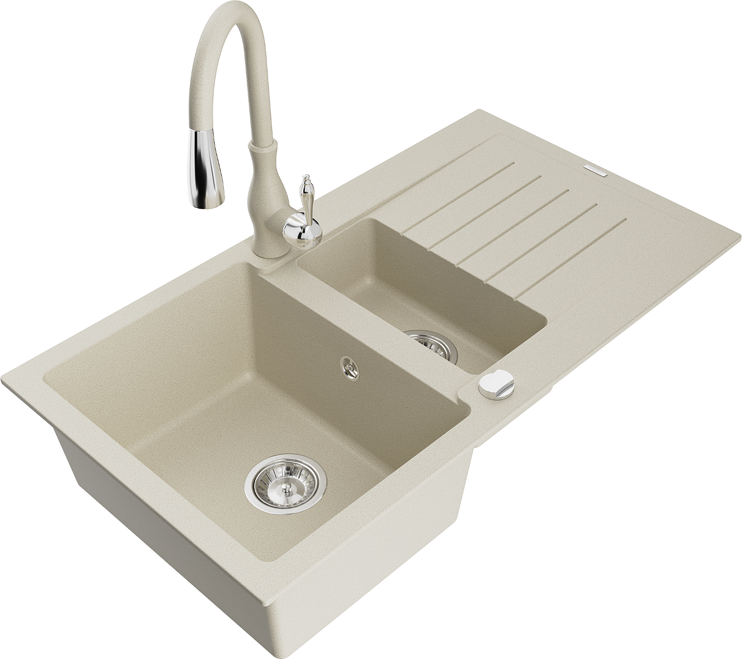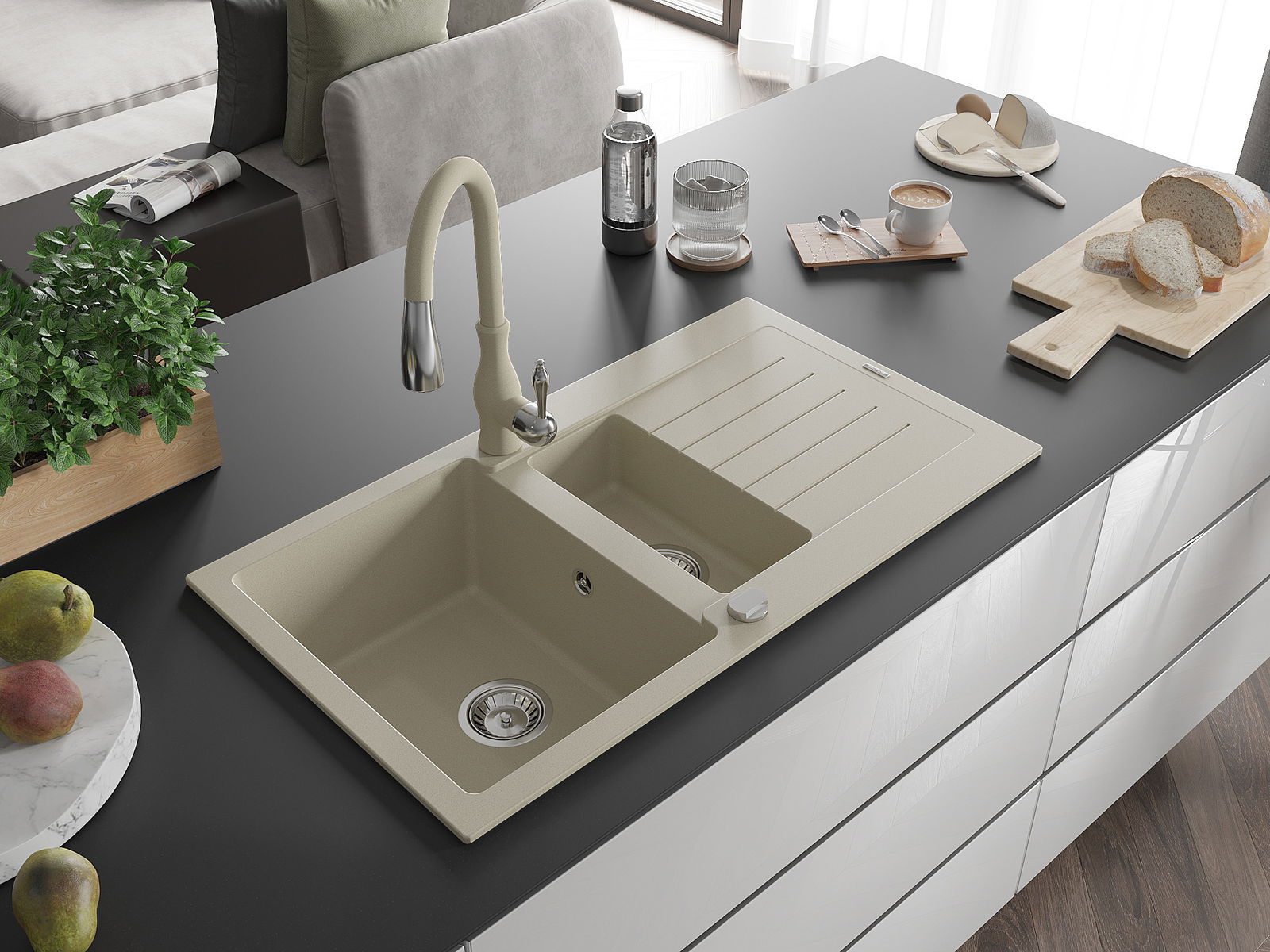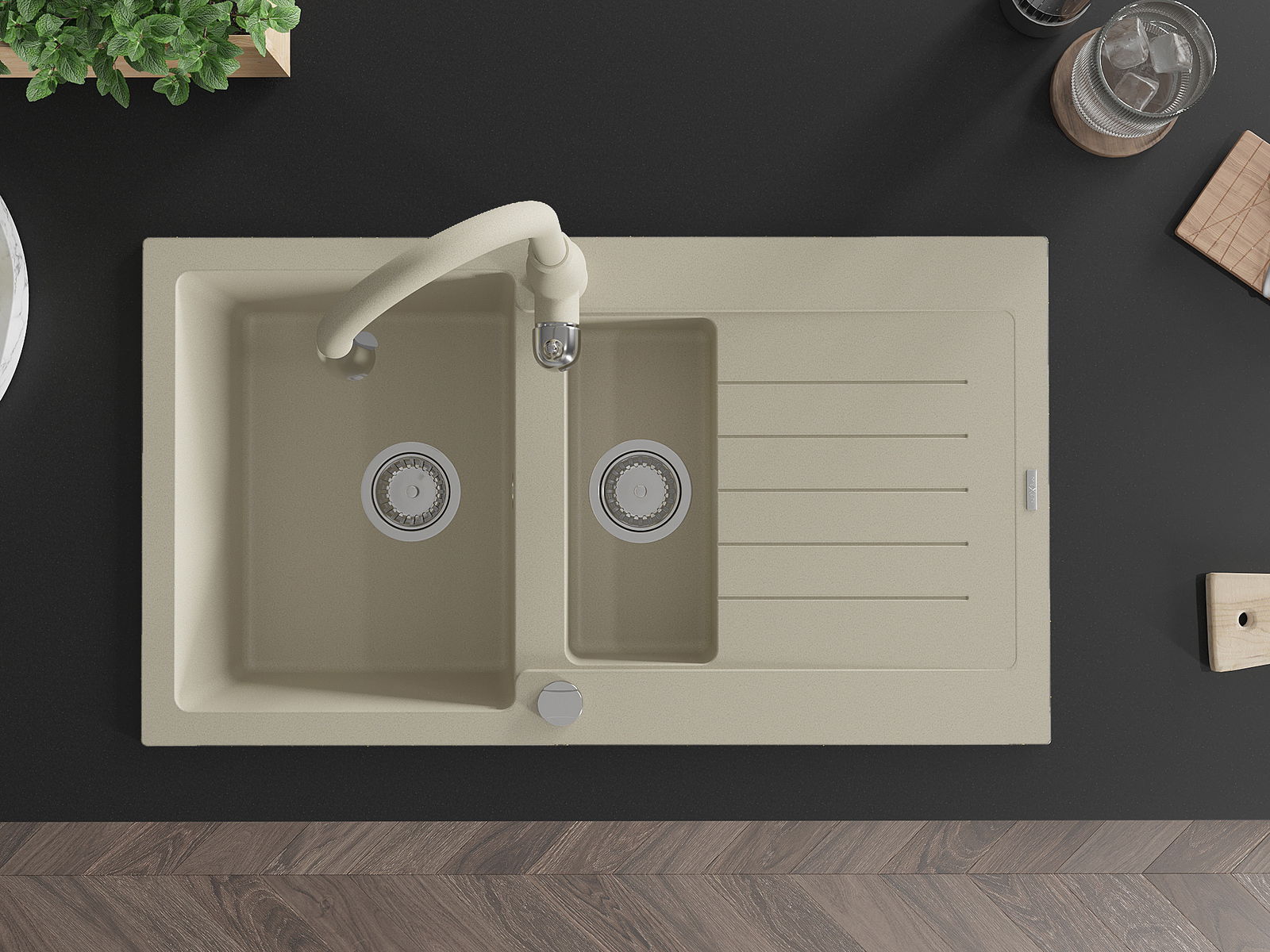 Mexen Matias lava-louça de granito com 1,5 cuba e escorredor e torneira de cozinha Savita, bege - 6502-69-672601-69