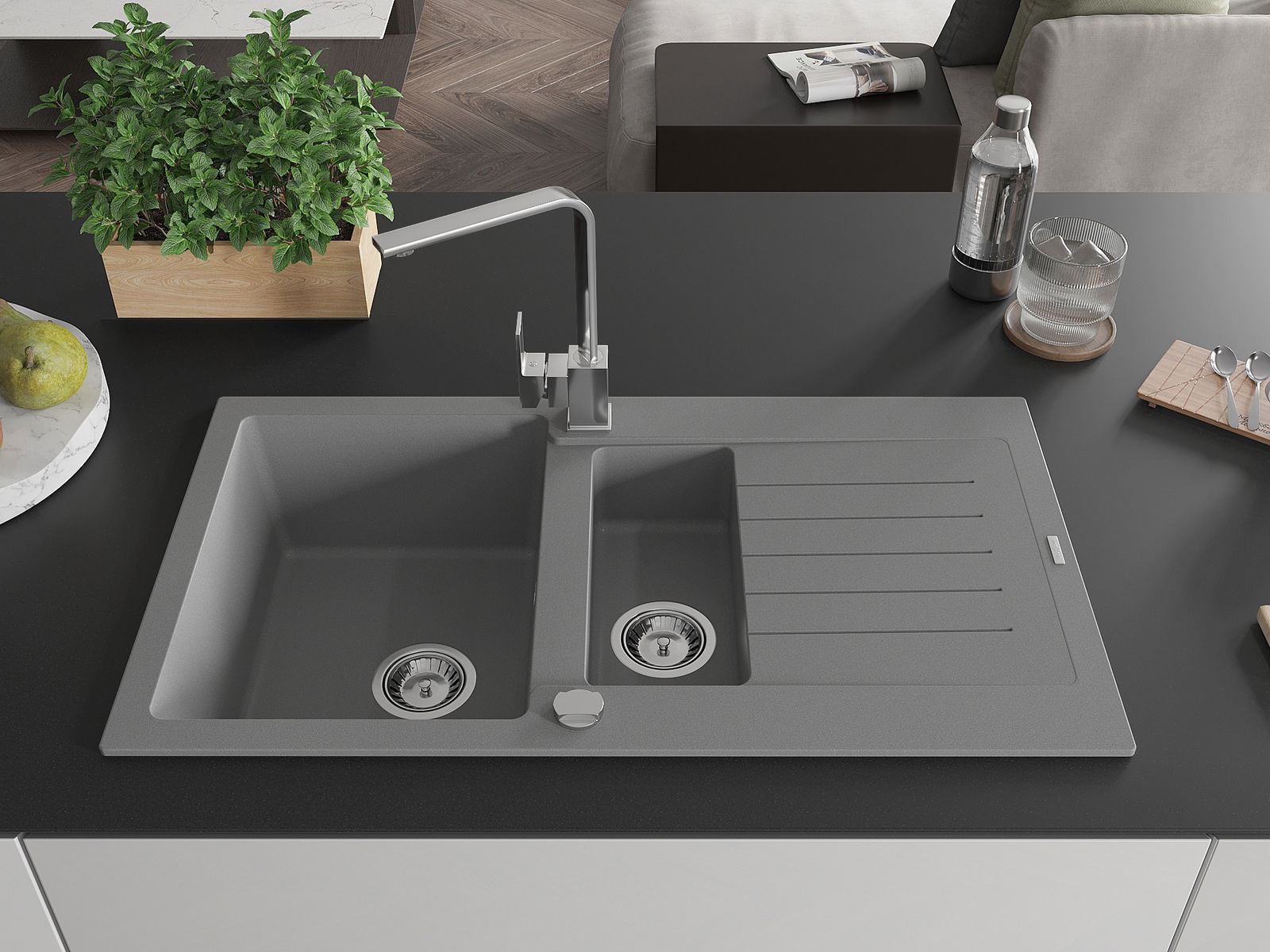O lava-loiça é feito de granito de alta qualidade. Constitui um complemento elegante, e acima de tudo prático, para qualquer cozinha, independentemente do seu estilo. A alta qualidade e durabilidade do granito garantem muitos anos de utilização.