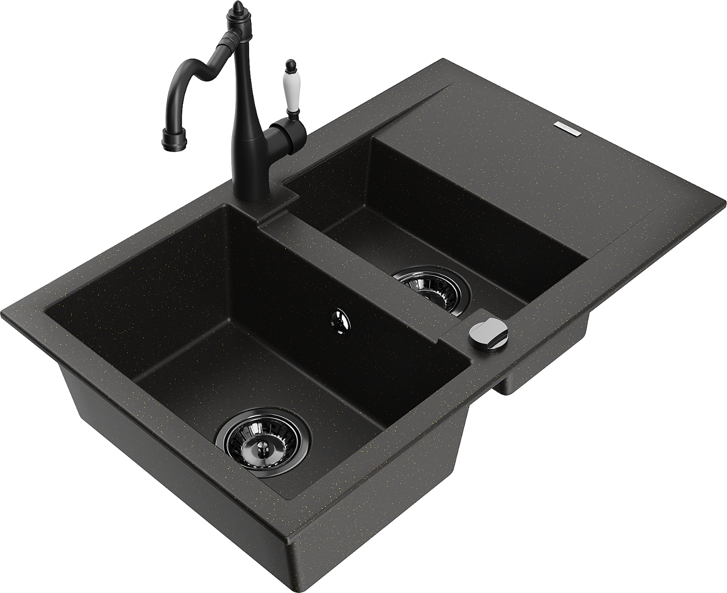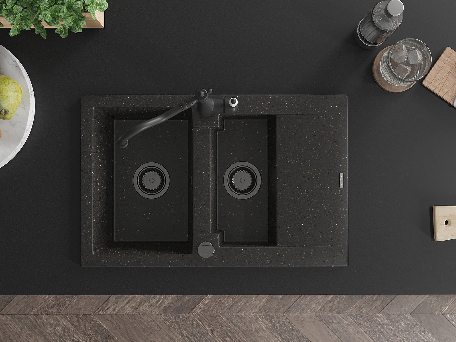 Mexen Gaspar lava-louças de granito com 1,5 compartimentos com escorredor e torneira cozinha Carla preto/dourado metálico