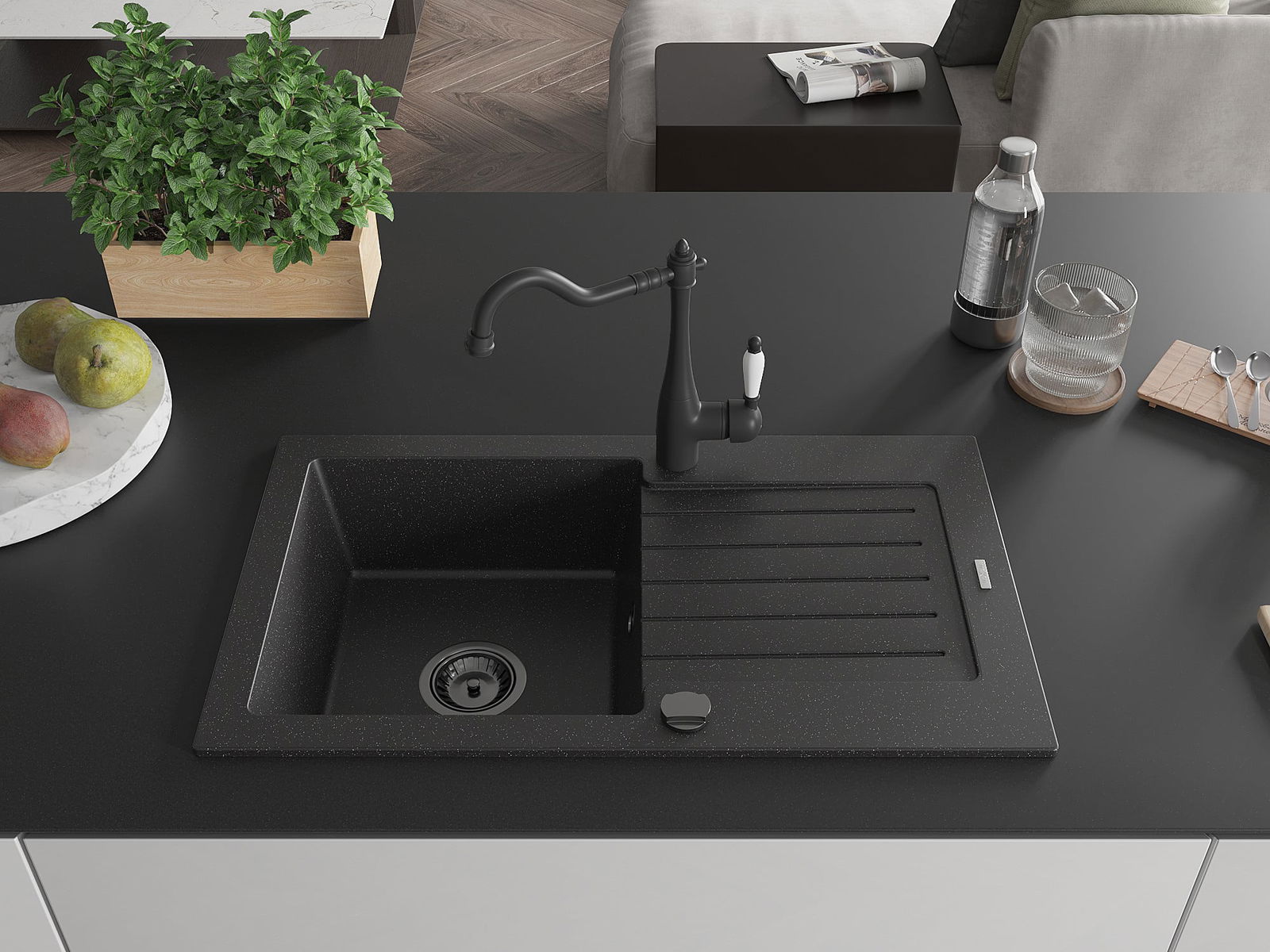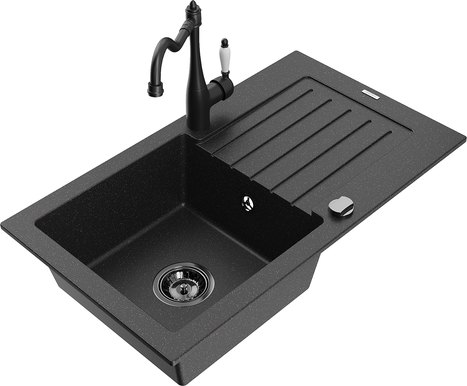Mexen Pablo lava-loiça de granito de uma cuba com escorredor e torneira de cozinha Carla, preto/metálico prateado