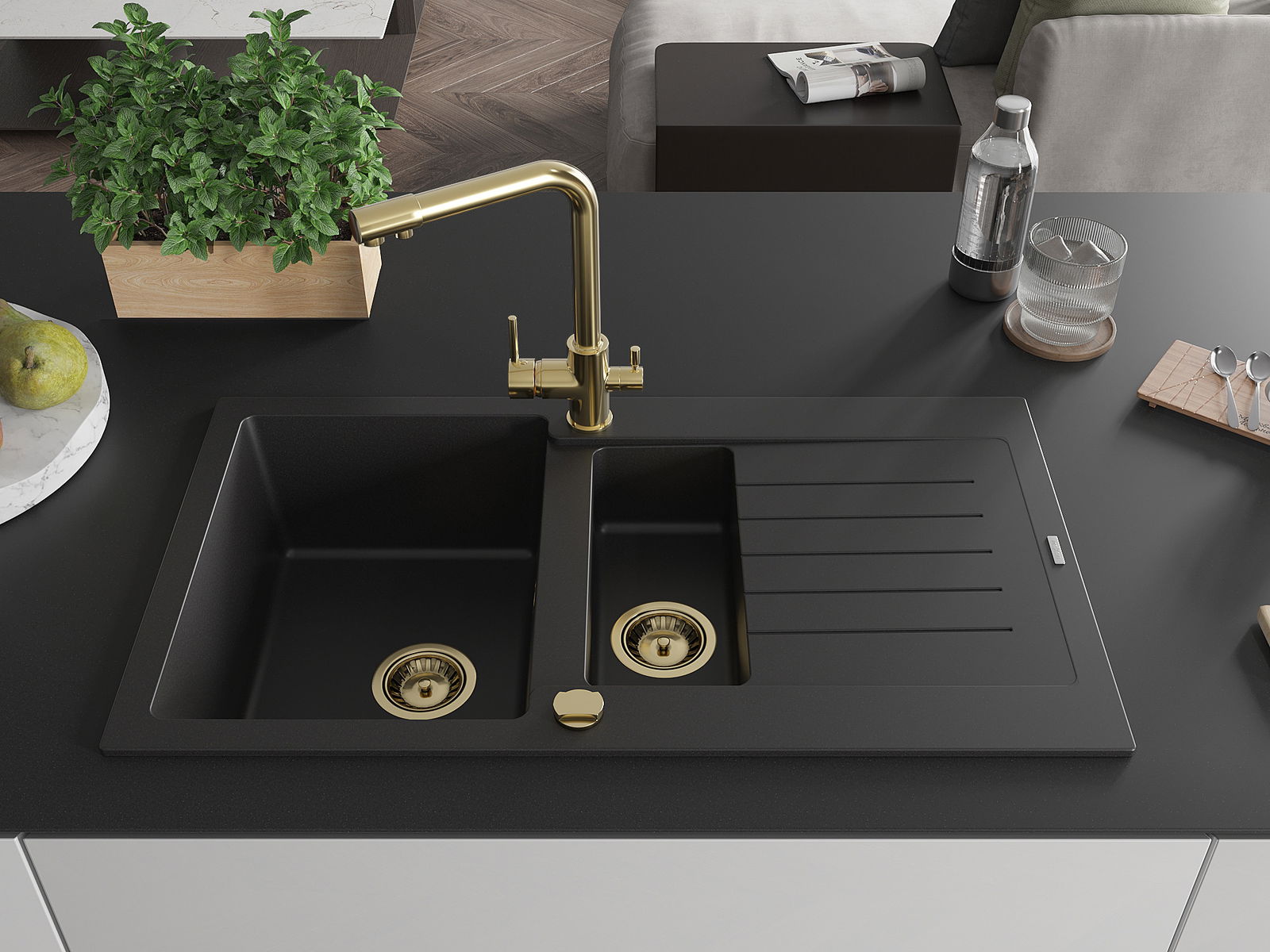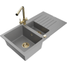 Mexen Matias lava-loiça de granito de 1,5 bacias com escorredor e torneira de cozinha Duero, preto - 6502-77-671600-50