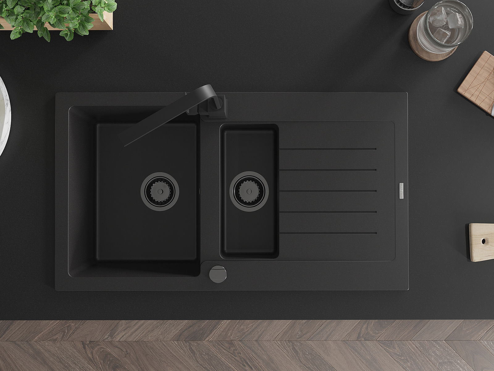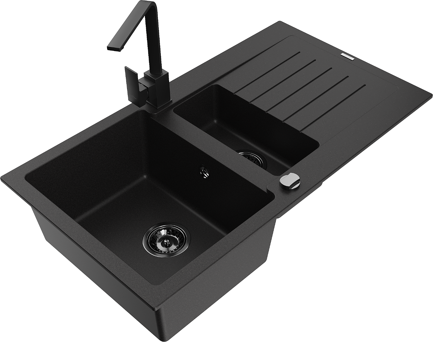 Mexen Matias lava-loiça de granito 1,5 cubas com escorredor e torneira de cozinha Rita, preto - 6502-77-670300-70-B