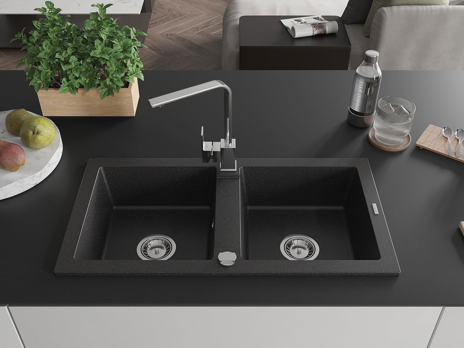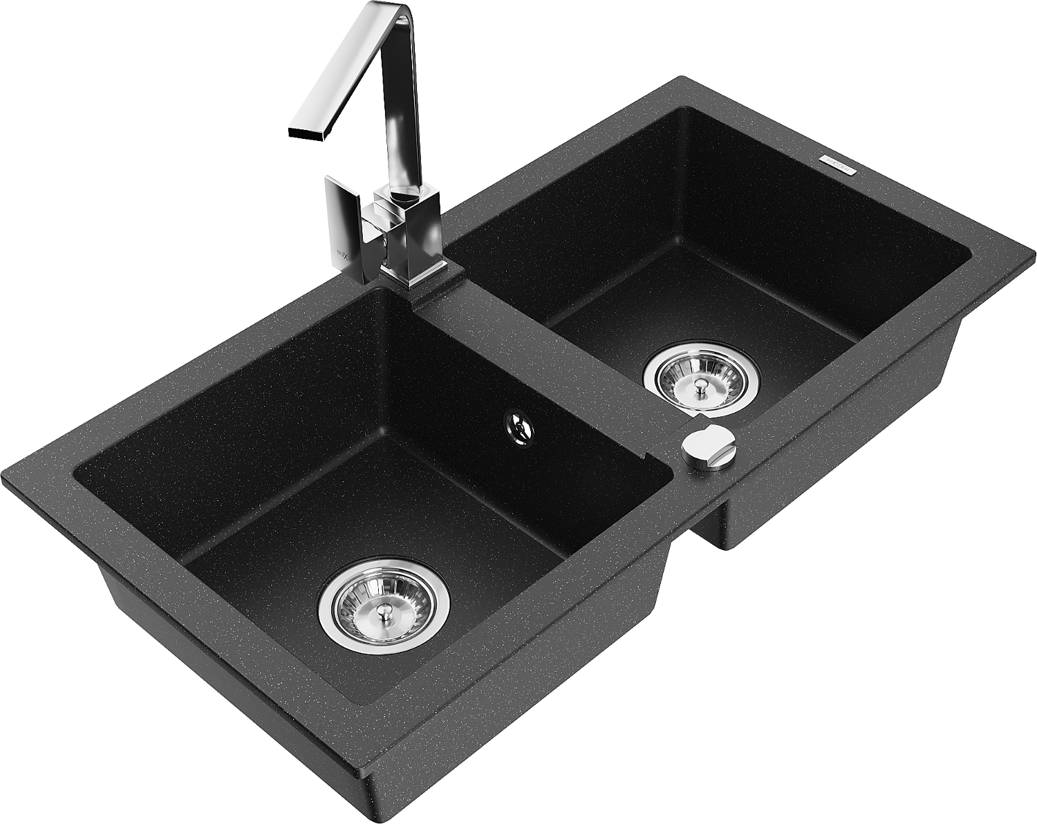 Mexen Mario lava-loiças de granito de 2 cubas com torneira de cozinha Rita, preto/metálico prateado - 6504-73-670300-00
