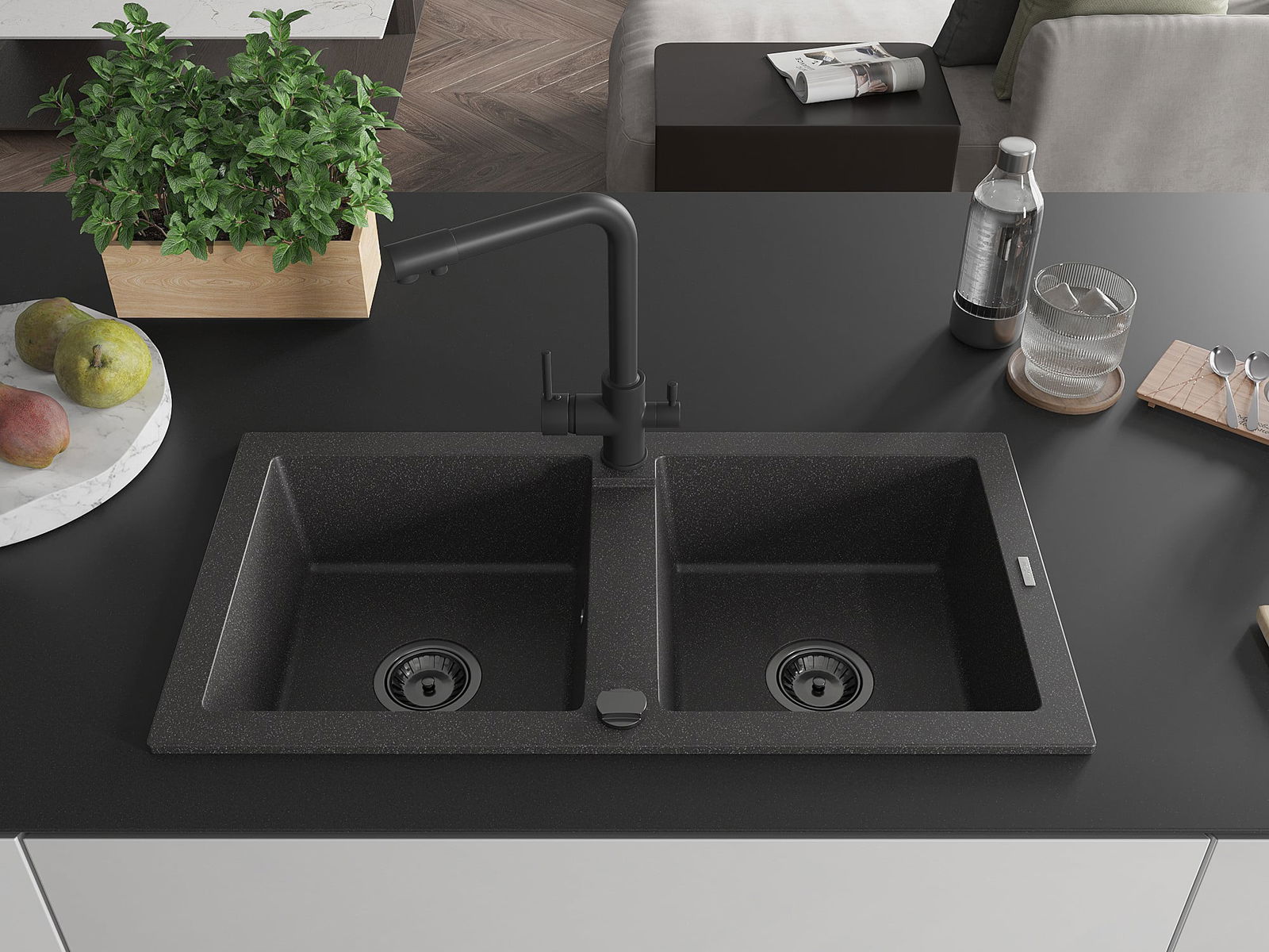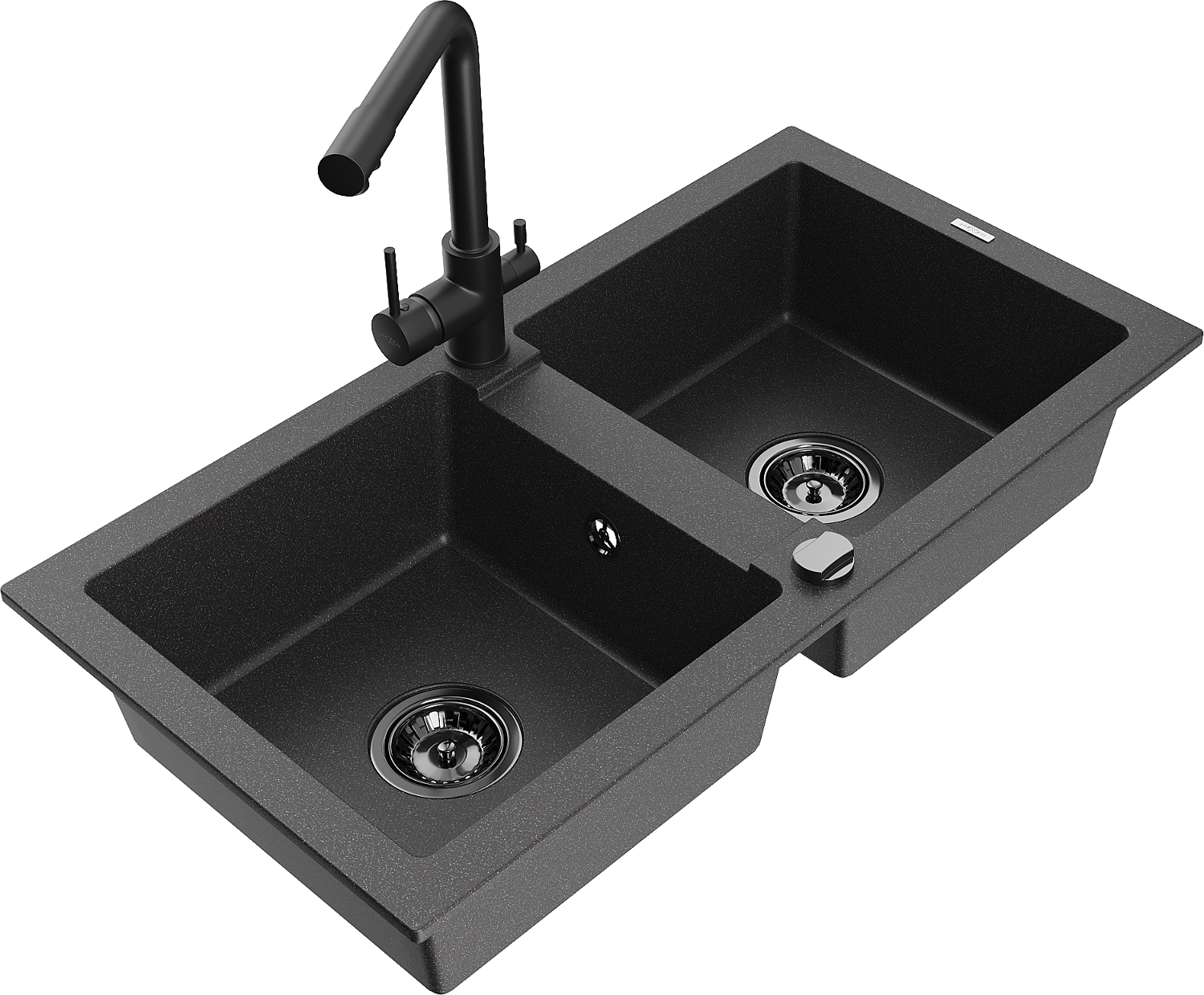 Mexen Mario lava-loiça de granito com 2 cubas e torneira de cozinha Duero, preto salpicado - 6504-76-671600-70-B