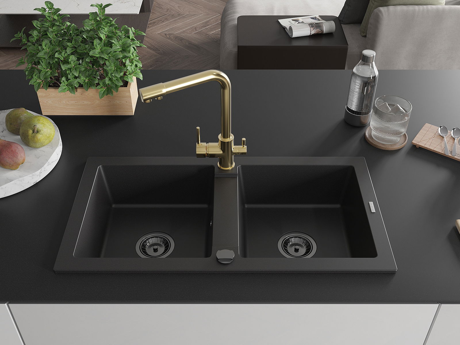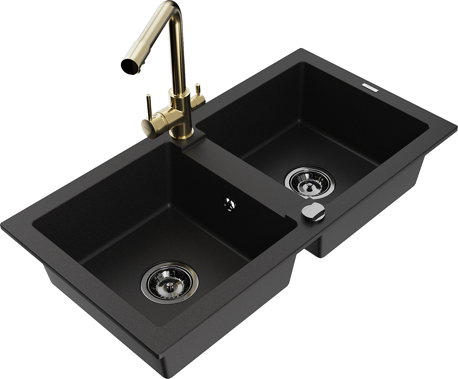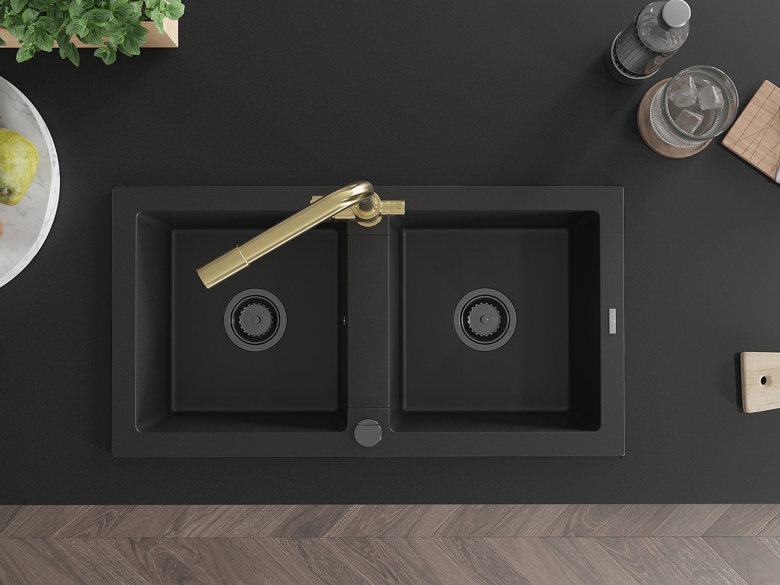 Mexen Mario lava-louça de granito com 2 cubas e torneira de cozinha Duero, preto - 6504-77-671600-50-B