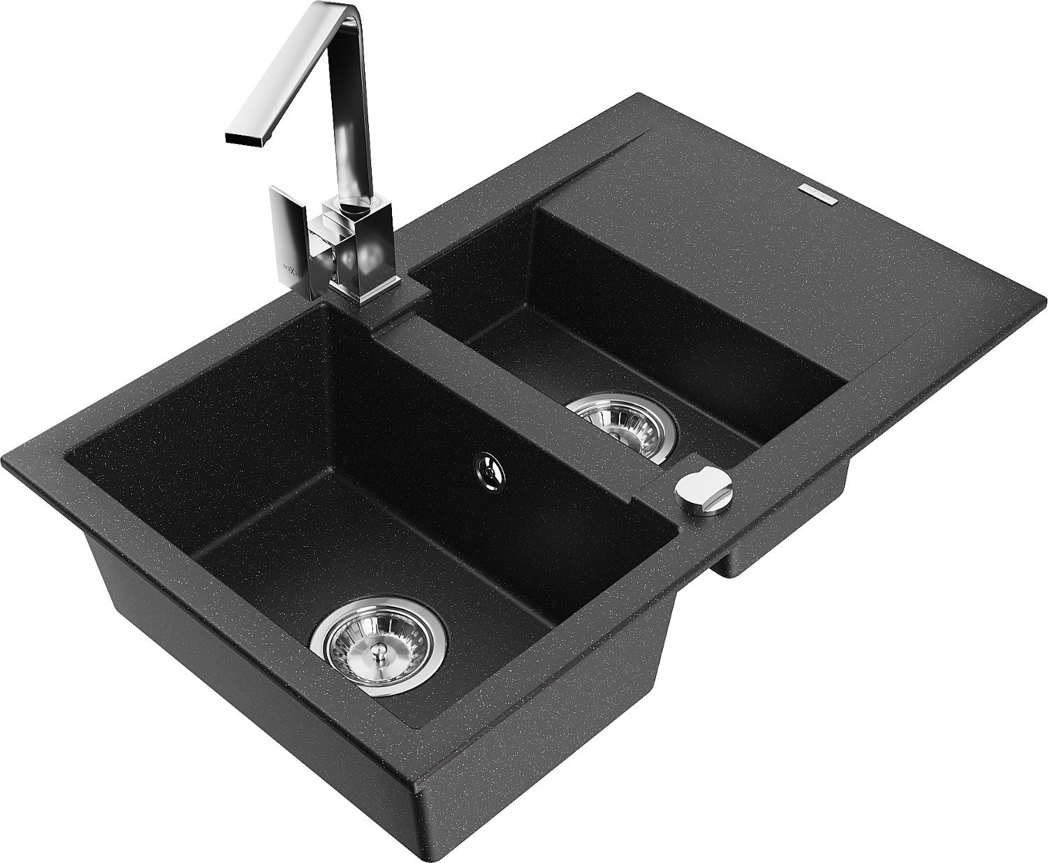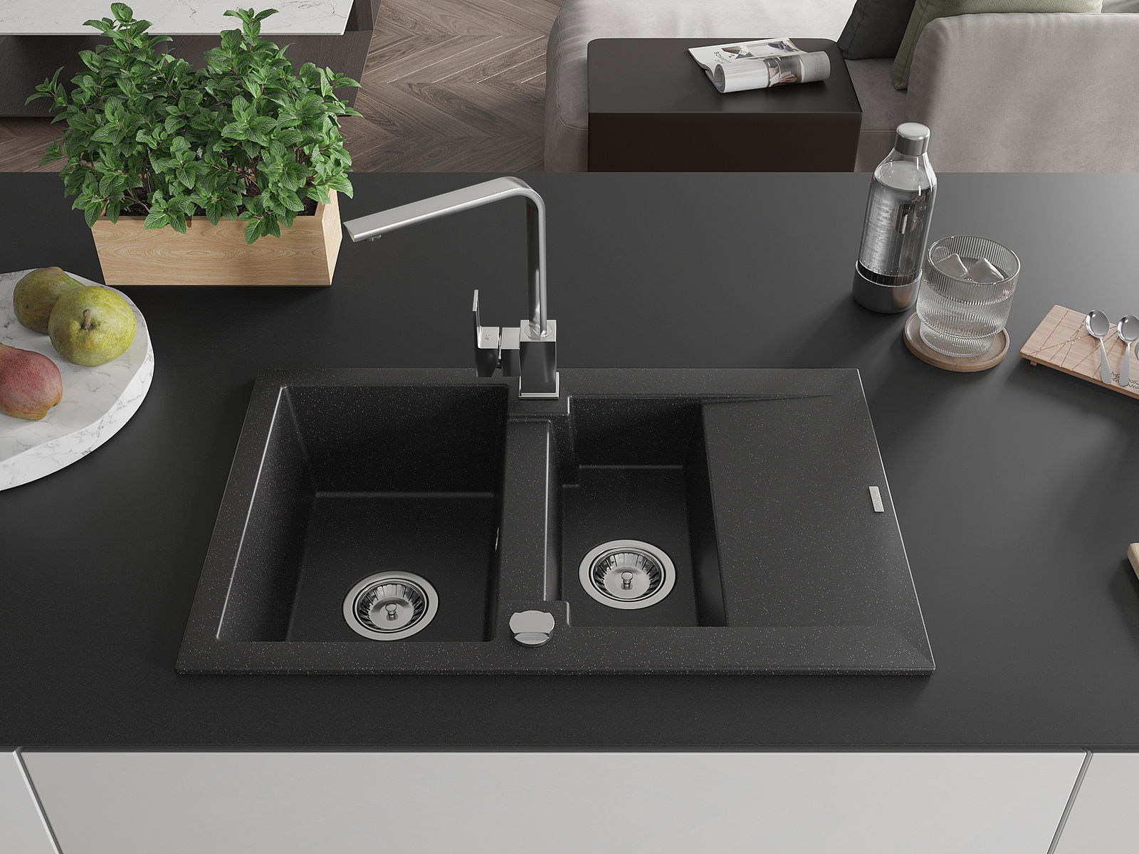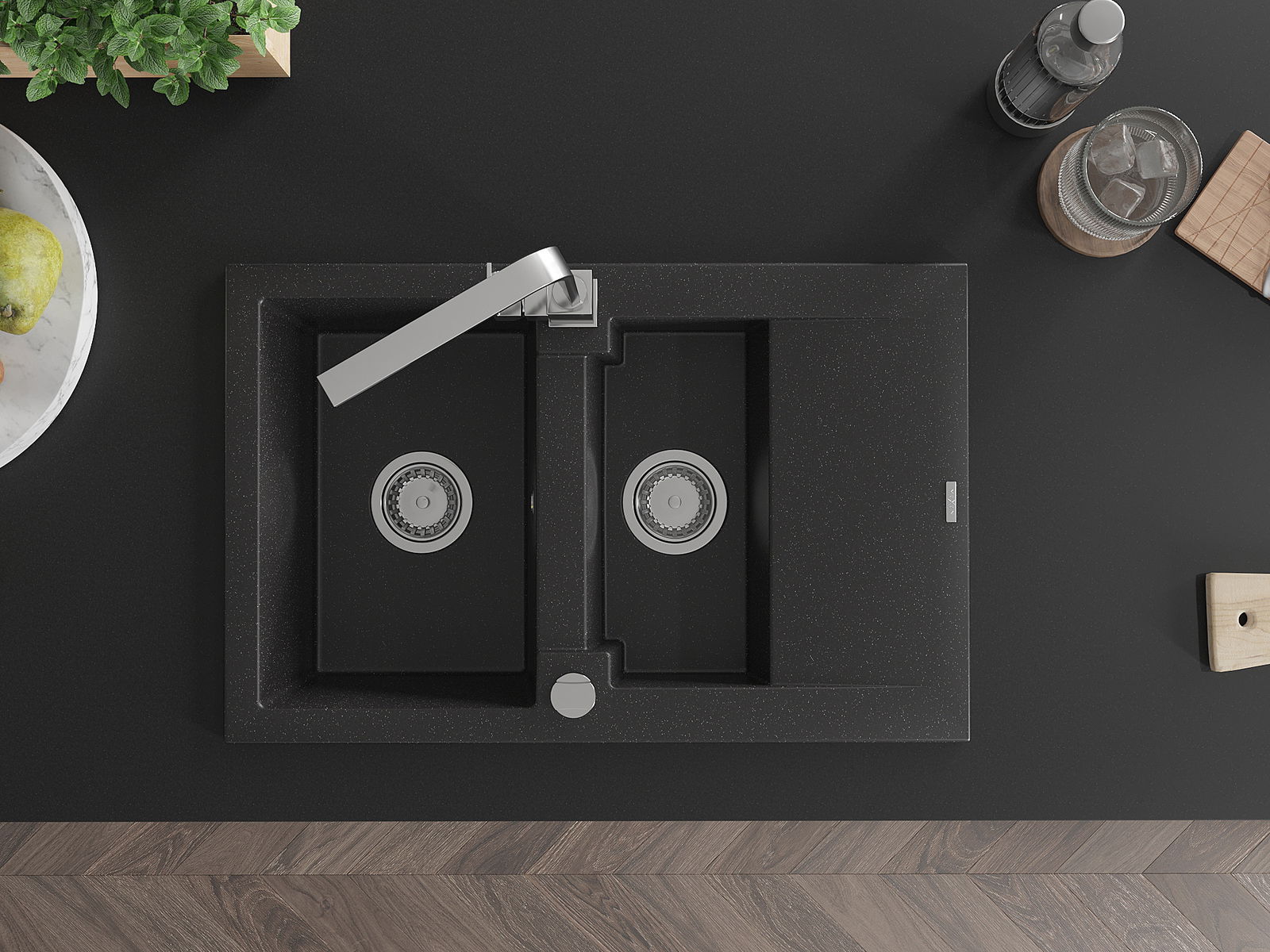 Mexen Gaspar lava-loiça de granito com 1,5 cubas com escorredor e torneira de cozinha Rita, preto/prateado metálico