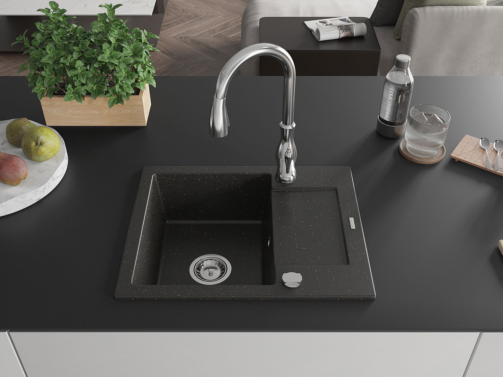 Mexen Enzo lava-loiça de granito com 1 cuba e escorredor com torneira de cozinha Savita, preto/dourado metálico