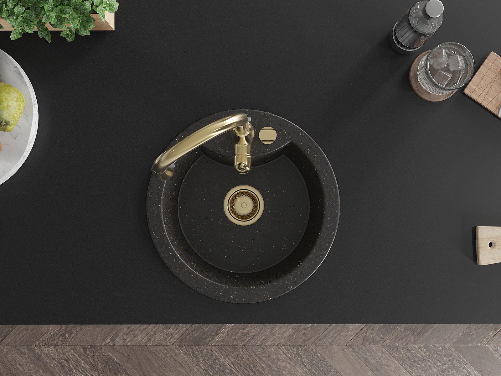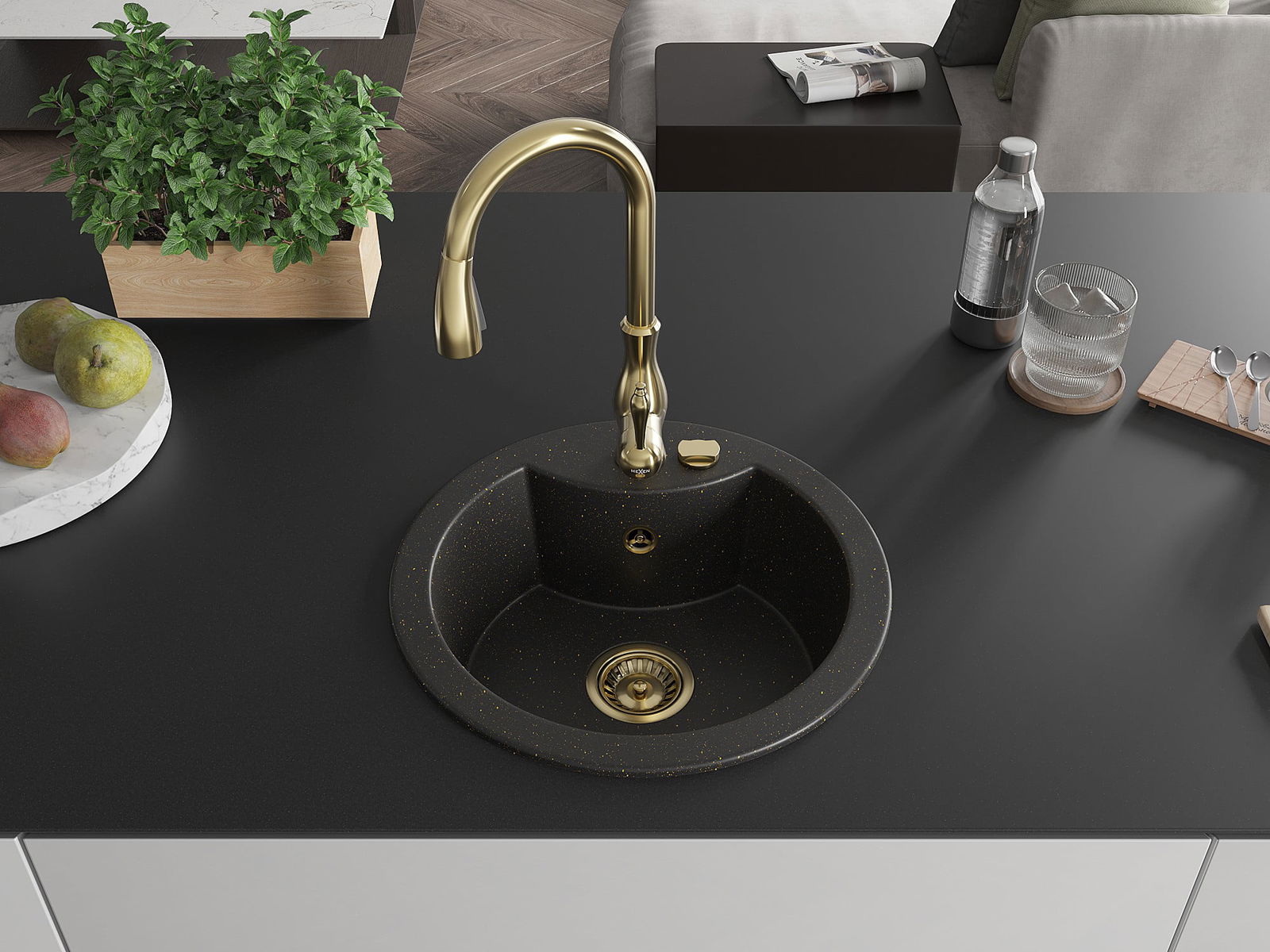Mexen Diego lava-loiça de granito de 1 cuba com torneira de cozinha Savita, preto/dourado metálico - 6512-75-672601-50