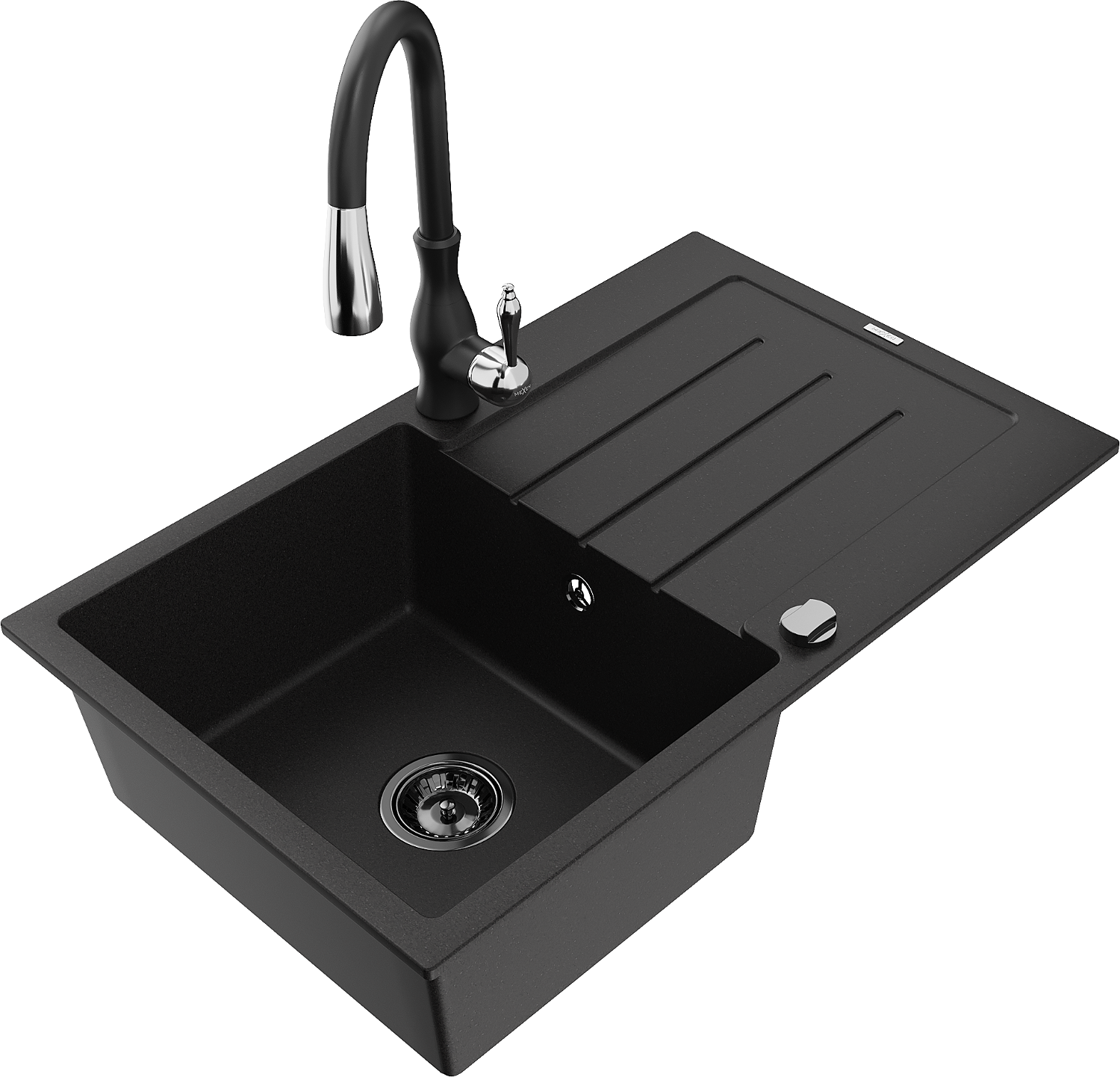 Mexen Bruno lava-louça de granito com 1 bacia com escorredor e torneira de cozinha Savita, preto - 6513-77-672601-70-B