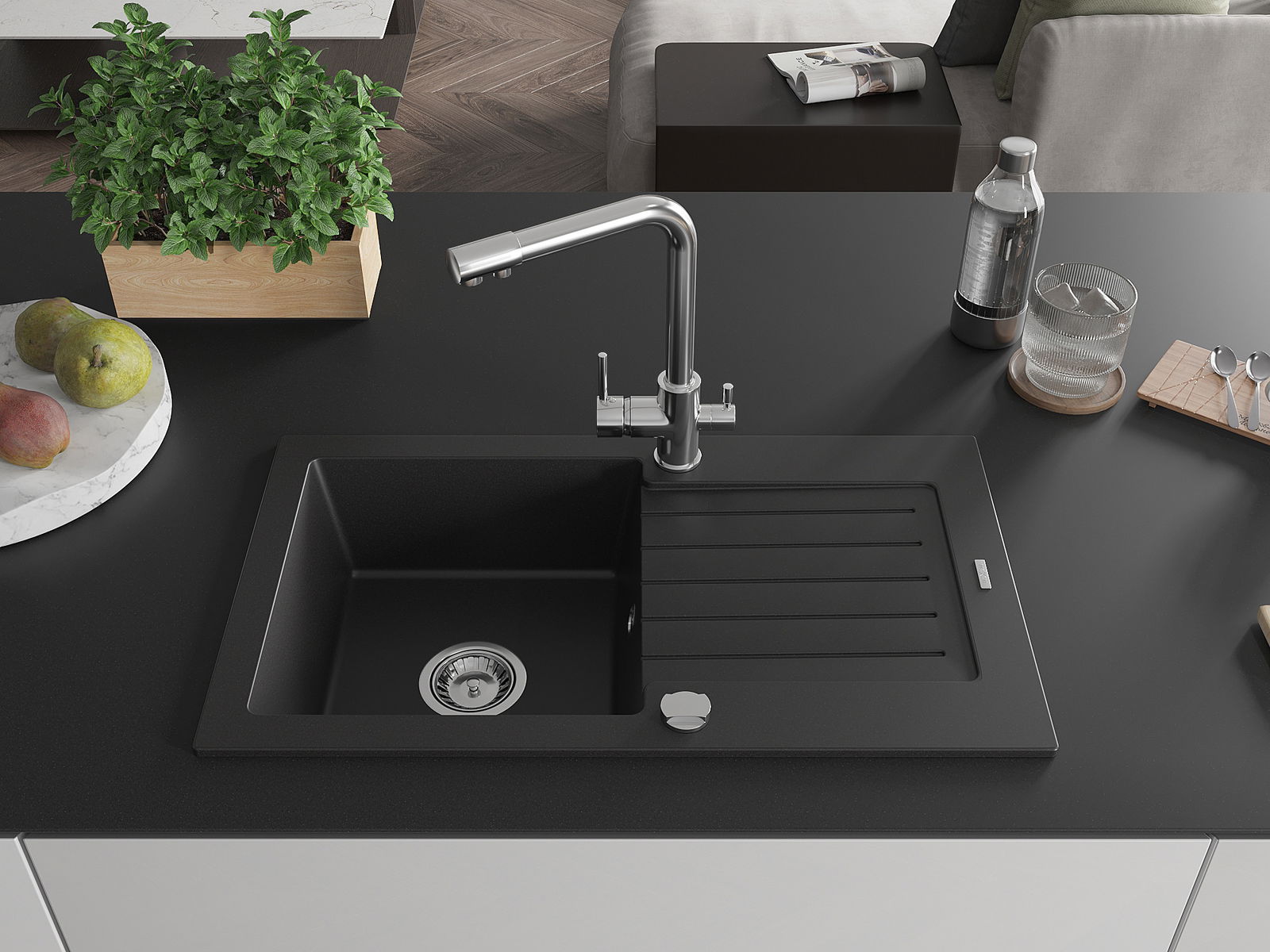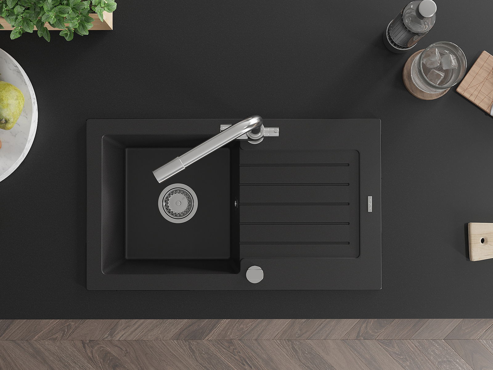O lava-loiça é feito de granito de alta qualidade. Constitui um complemento elegante, e acima de tudo prático, para qualquer cozinha, independentemente do seu estilo. A alta qualidade e durabilidade do granito garantem muitos anos de utilização.