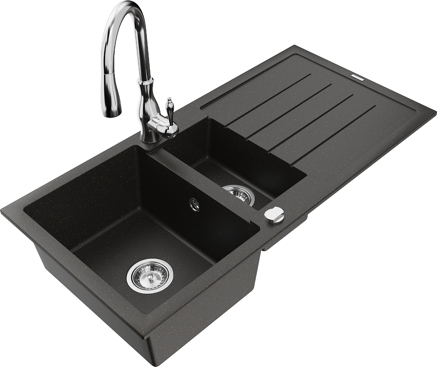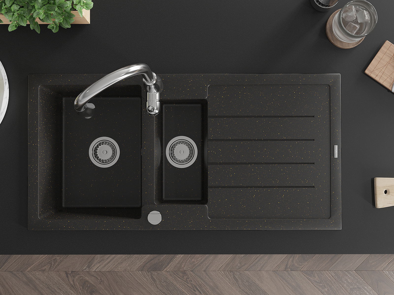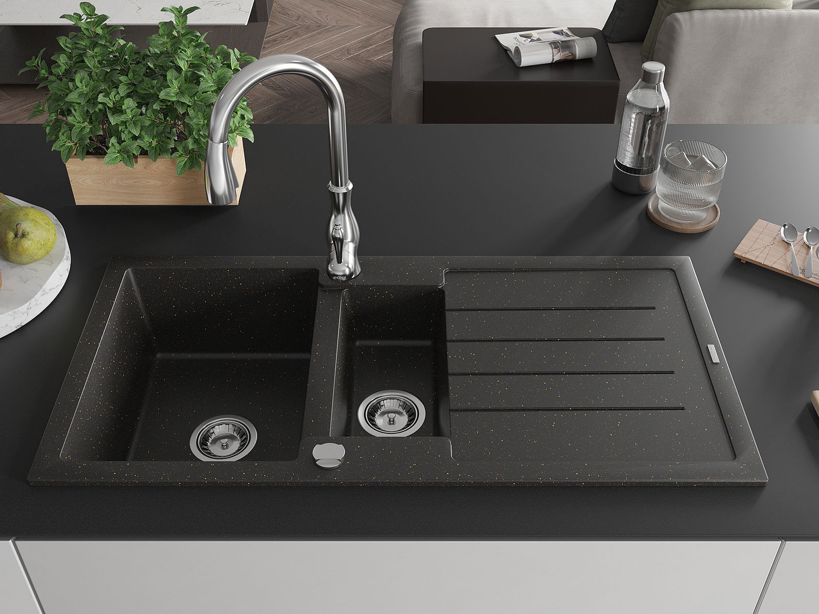 Mexen Andres lava-louça de granito com 1,5 compartimentos com escorredor e torneira de cozinha Savita, preto/dourado metálico