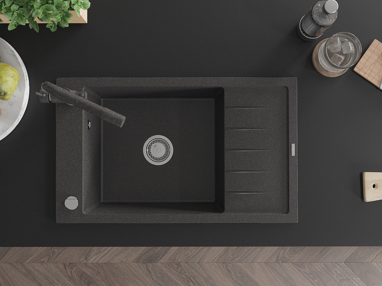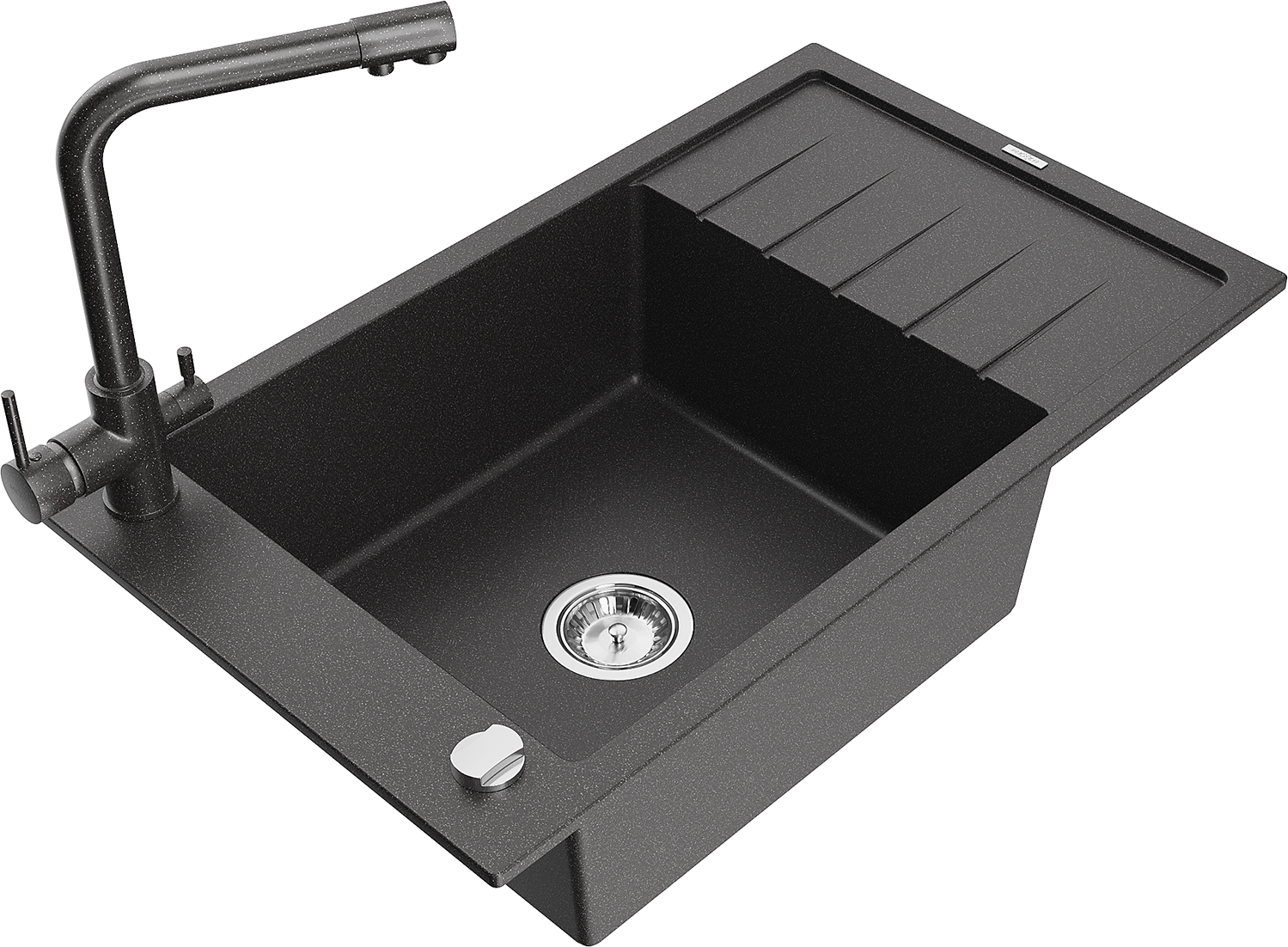 Mexen Elias lava-loiça de granito de uma bacia com escorredor e torneira de cozinha Duero, preto salpicado - 6511-76-671600-76