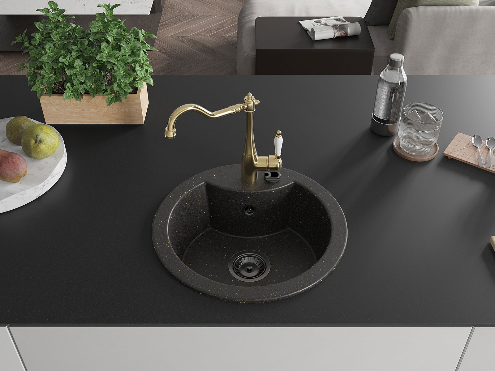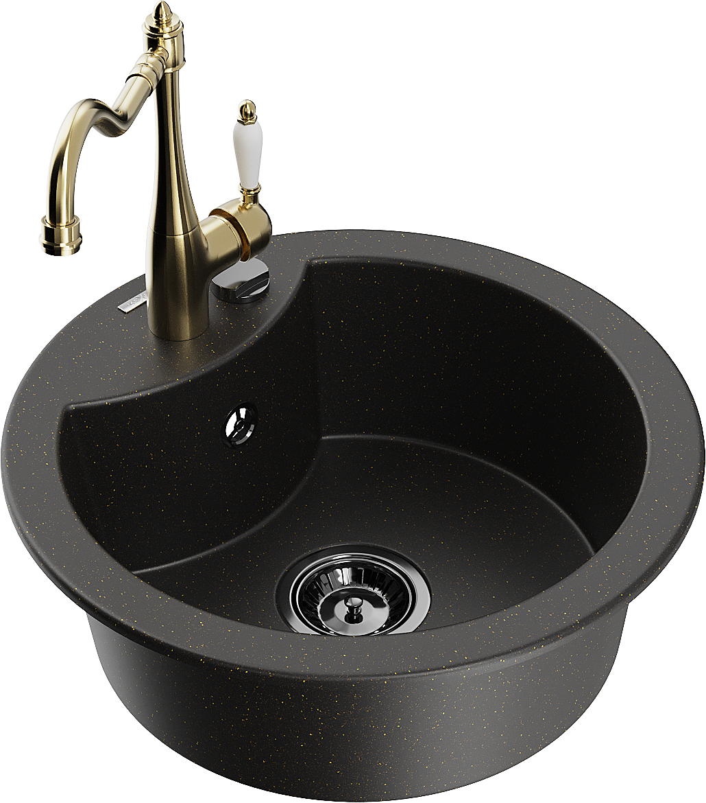 Mexen Diego lava-loiça de granito de 1 cuba com torneira de cozinha Carla, preto/dourado metálico - 6512-75-670700-50-B