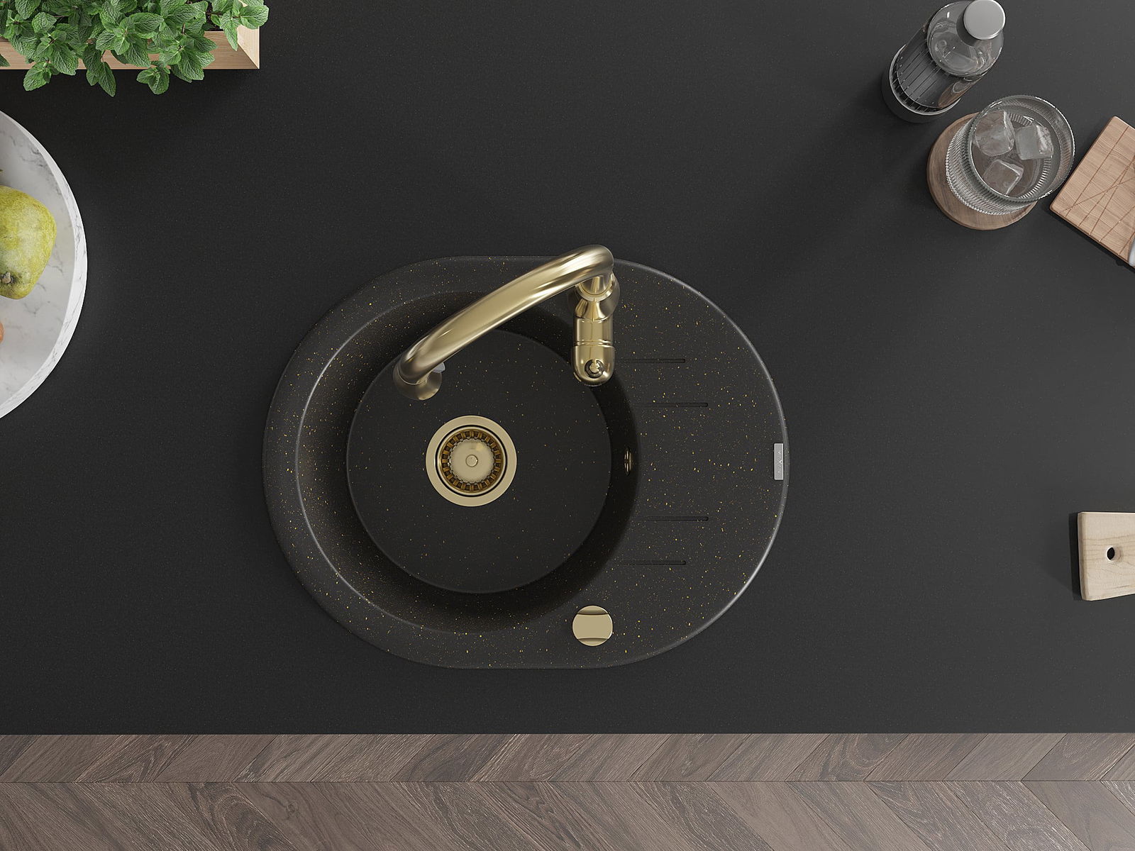Mexen Kevin lava-loiça de granito de 1 cuba com escorredor e torneira de cozinha Savita, preto/dourado metálico