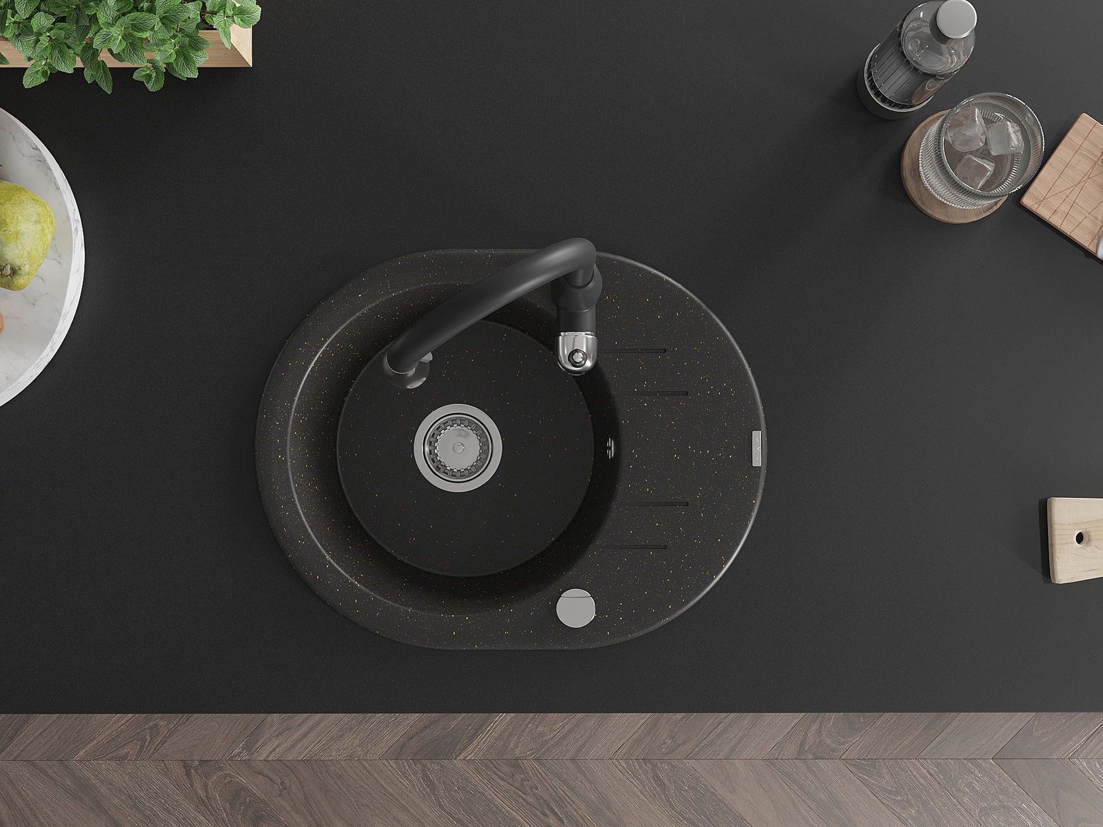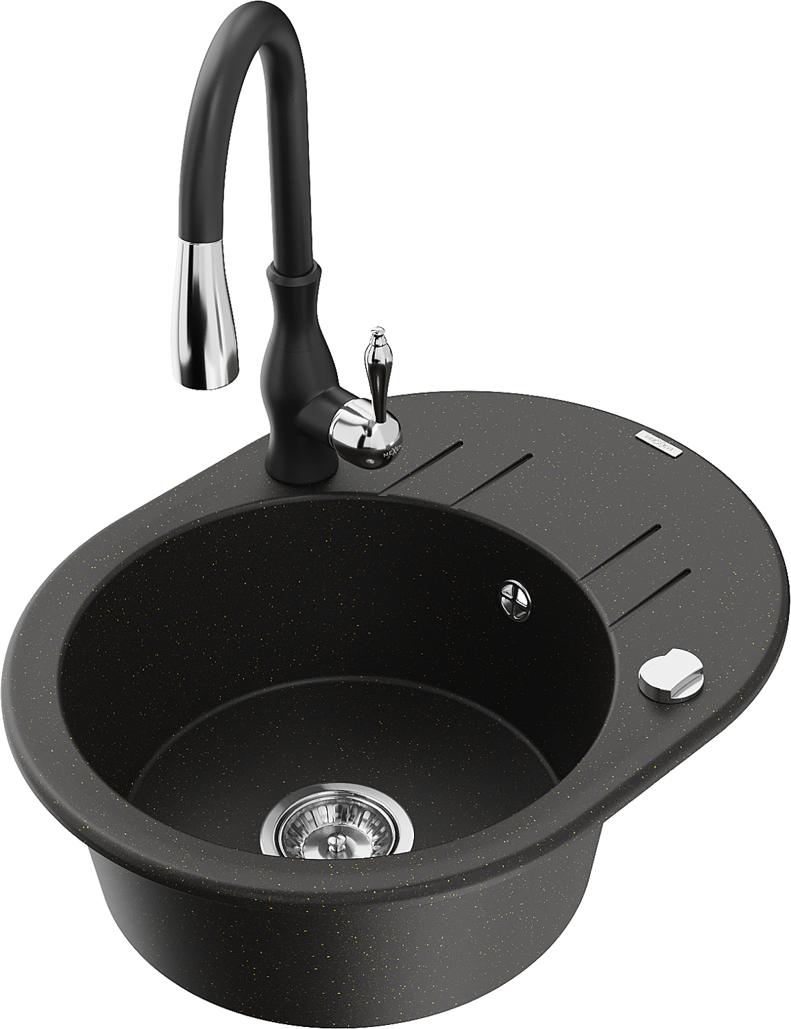 Mexen Kevin lava-loiça de granito de 1-cuba com escorredor e torneira de cozinha Savita, preto/dourado metálico