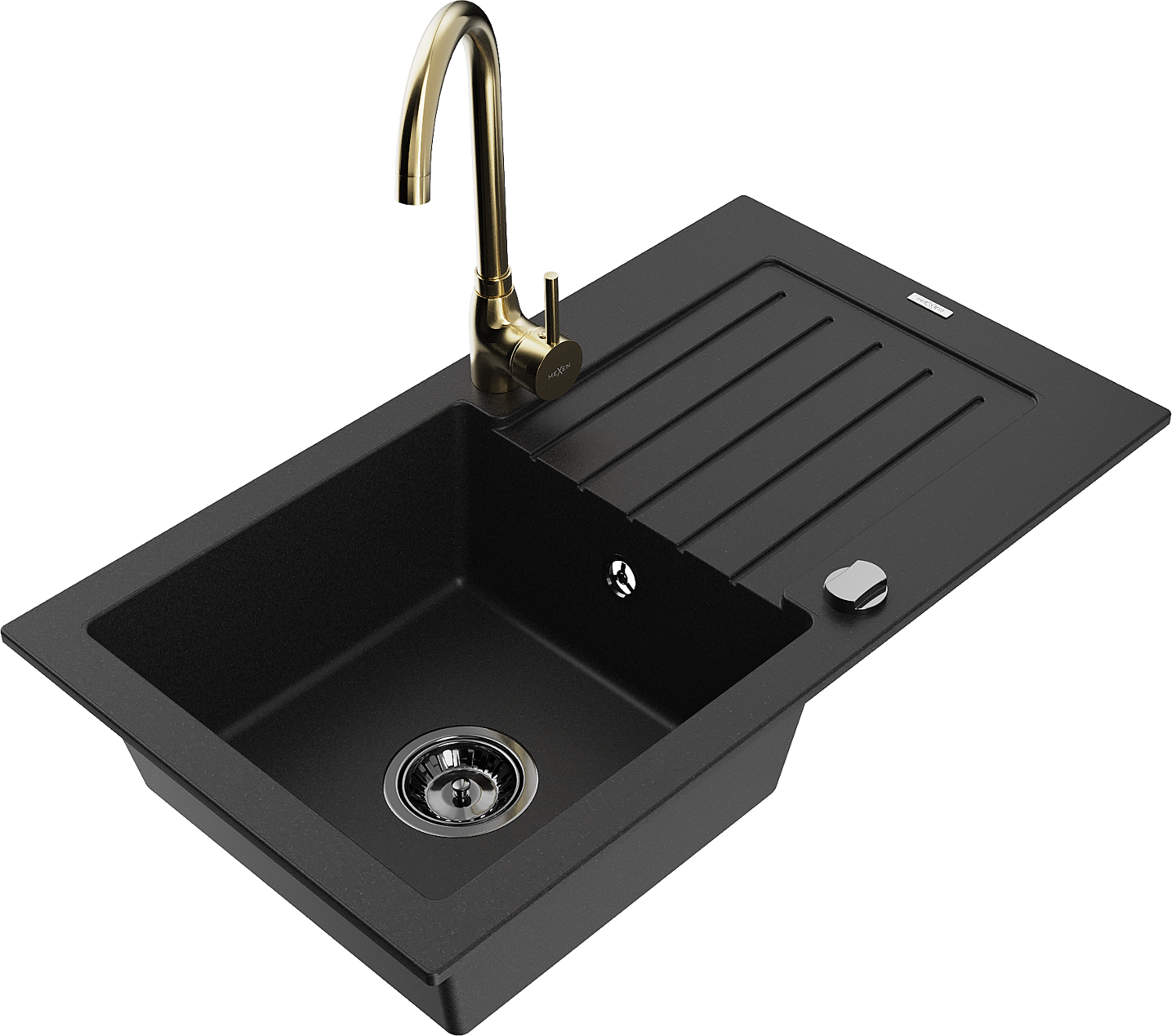 Mexen Pablo lava-louça em granito com 1 cuba com escorredor e torneira de cozinha Telma, preto - 6510-77-670200-50-B