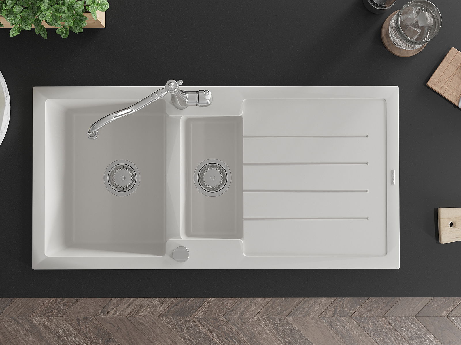 Mexen Andres lava-louça de granito 1,5-com compartimento com escorredor e torneira de cozinha Carla, branco - 6515-20-670700-00